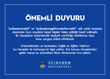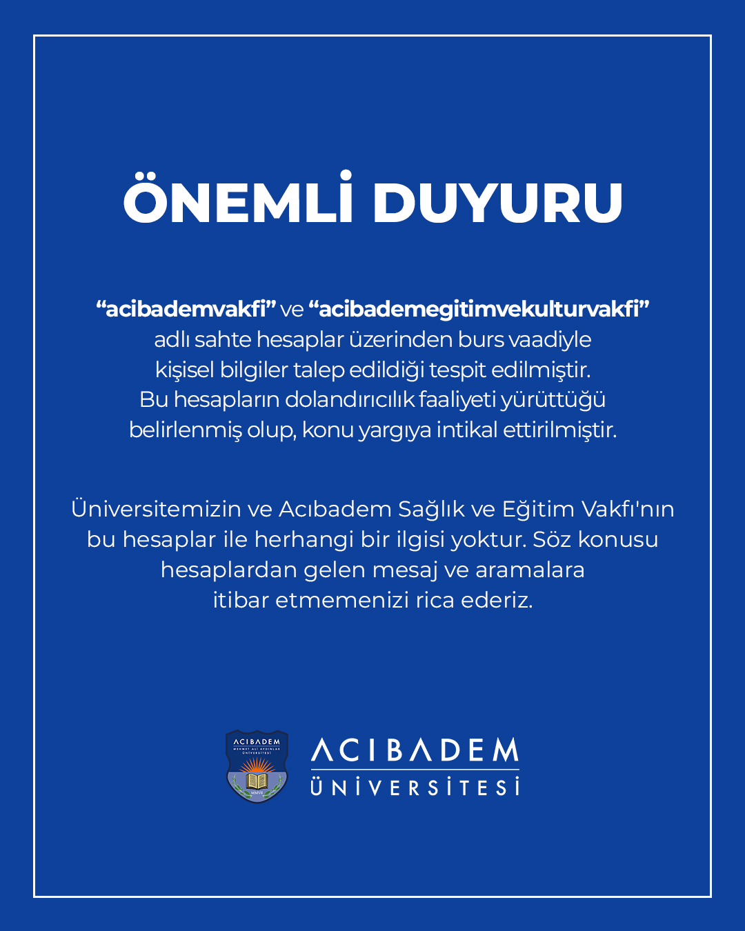 “acibademvakfi” ve “acibademegitimvekulturvakfi” adlı sahte hesaplar üzerinden burs vaadiyle kişisel bilgiler talep edildiği tespit edilmiştir. Bu hesapların dolandırıcılık faaliyeti yürüttüğü belirlenmiş olup, konu yargıya intikal ettirilmiştir. Üniversitemizin ve Acıbadem Sağlık ve Eğitim Vakfı'nın bu hesaplar ile herhangi bir ilgisi yoktur. Söz konusu hesaplardan gelen mesaj ve aramalara itibar etmemenizi rica ederiz.