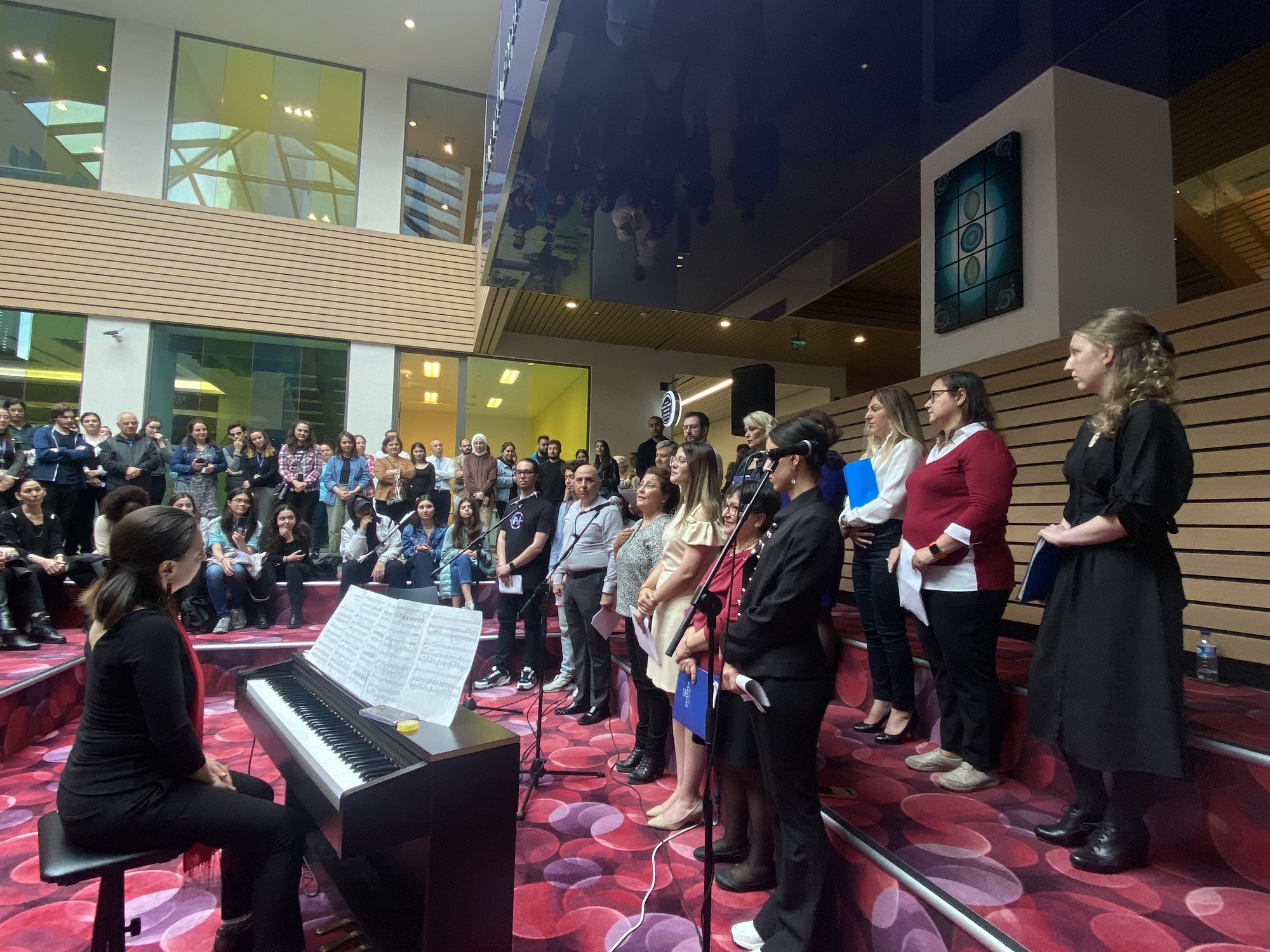 As part of the celebrations for the Commemoration of Atatürk, Youth and Sports Day on May 19th, the choir, conducted by Filiz Özay and accompanied by pianist Halide Aslan, presented a diverse repertoire of songs, including those beloved by Mustafa Kemal Atatürk. The concert featured performances by Tanıl Kocagöz, Levent Yalçın, Gülsün Ekicioğlu, Figen Demir, Can Südor, Tuğba Arsu, Özal İldeniz, Seda Oğuzay, İlknur Şentürk, Şeymanur Karaca, Emir Özgüven, Elif Ezgi Karatepe, Efe Arslanbek, and Derin Sağlar, bringing together a variety of songs to captivate the audience.