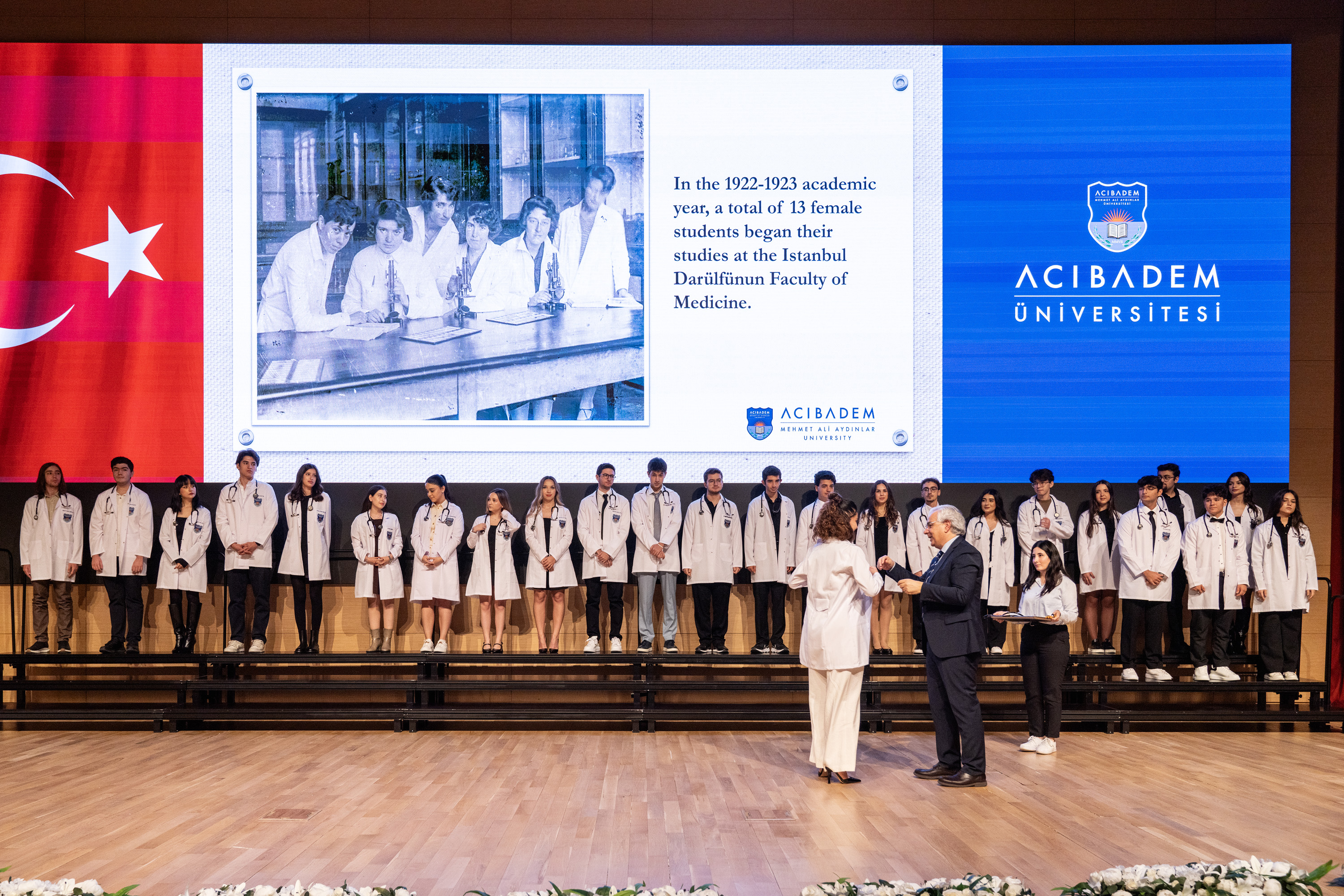 Attended by families and faculty members, the event was coordinated by Dr. Milena Can Özkan, a graduate of our Faculty of Medicine and a current resident in the Department of Anatomy. Throughout the ceremony, Dr. Özkan presented a talk prepared by the faculty members of the Department of the History of Medicine and Ethics, highlighting the history and symbolic meaning of the white coat in the medical profession.
