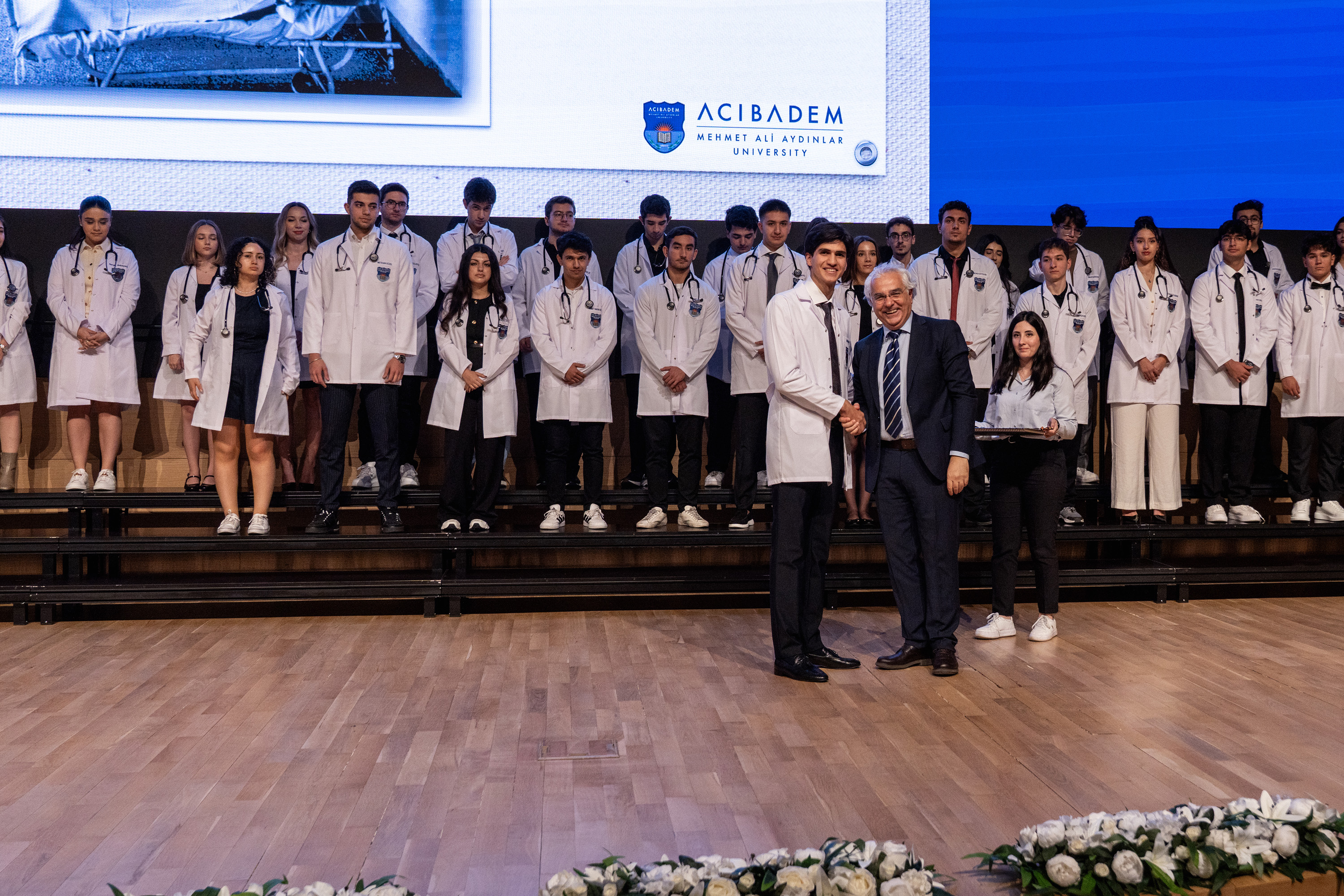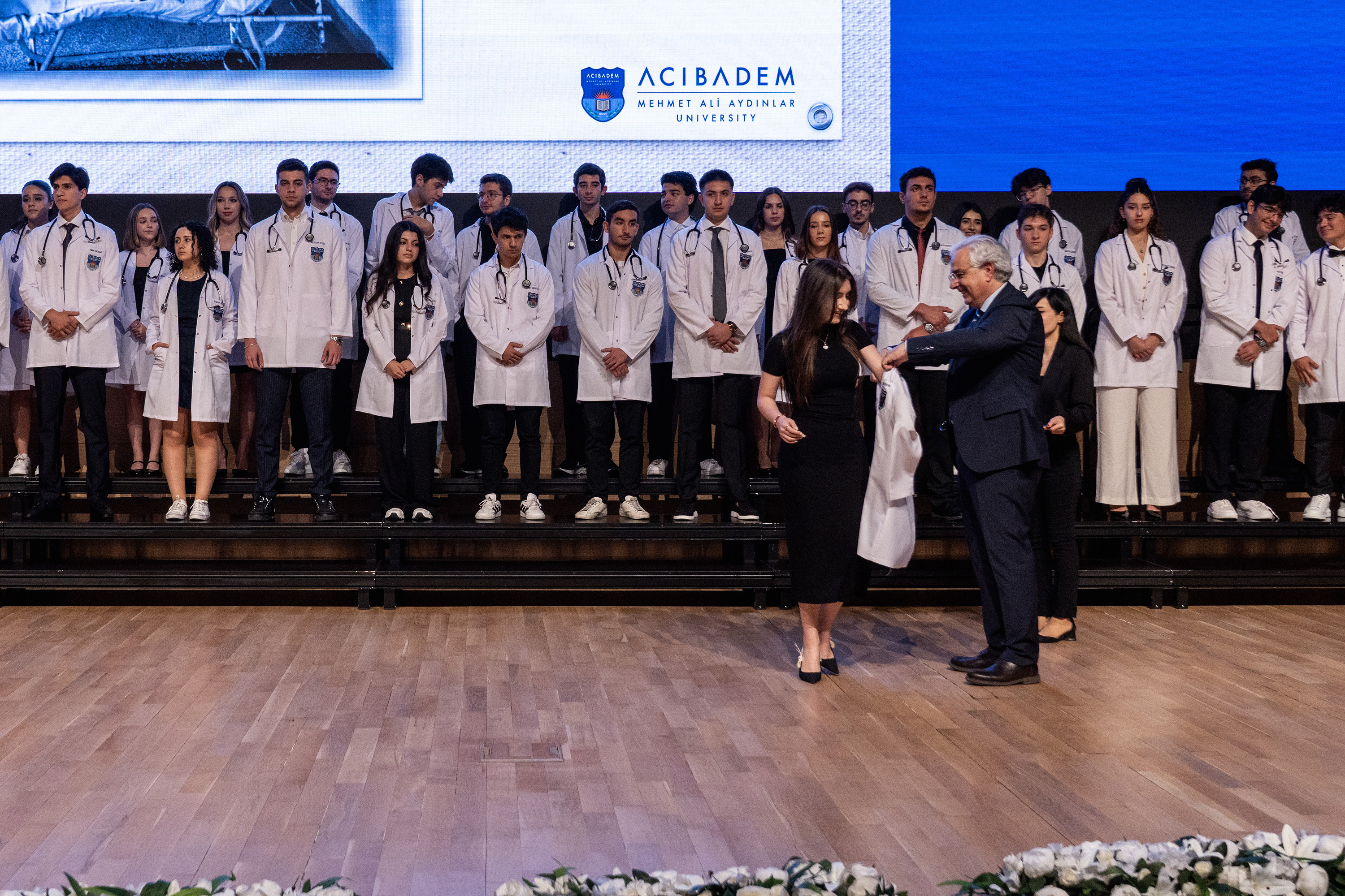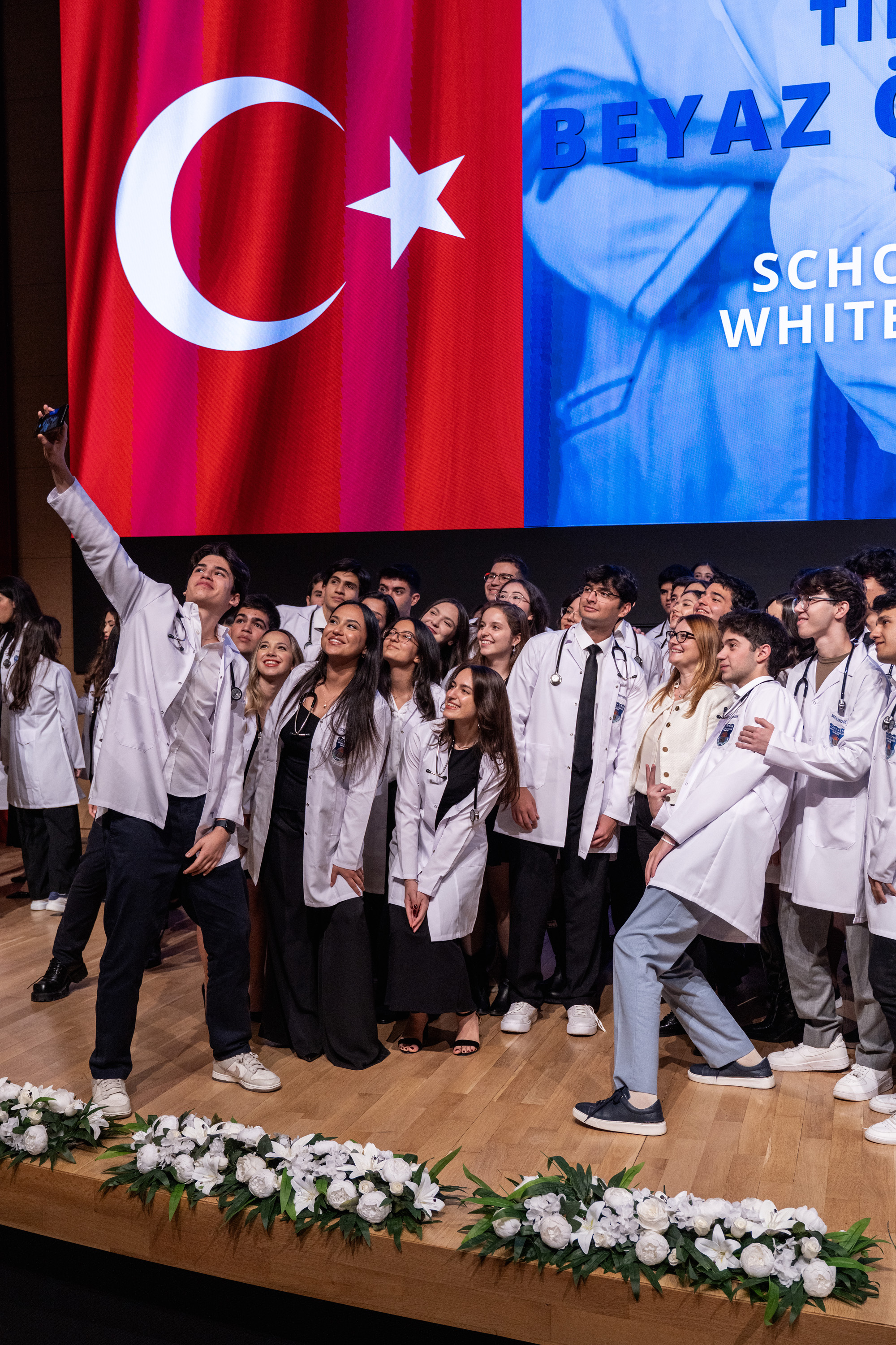 The ceremony concluded with the students gathering on stage for a group photo in their white coats, followed by warm applause from the audience.