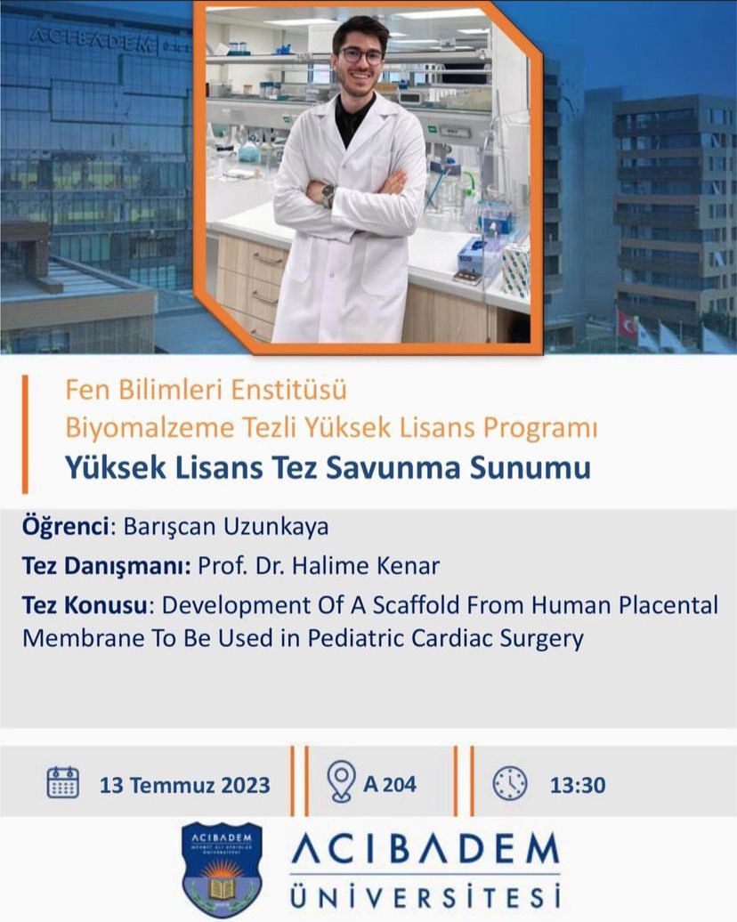 Join us as we proudly support our fellow Biomaterials Program master's student, Bariscan Uzunkaya, at Acıbadem Mehmet Ali Aydınlar University. Bariscan has been working diligently under the esteemed supervision of Prof. Dr. Halime Kenar and Prof. Dr. Vasif Nejat Hasirci to develop his intriguing thesis. The subject? "Development of a Scaffold from Human Placental Membrane to be Used in Pediatric Cardiac Surgeries". We are excited to hear him share his research and insights on July 13, 2023, at 1.30 PM in Room A204.