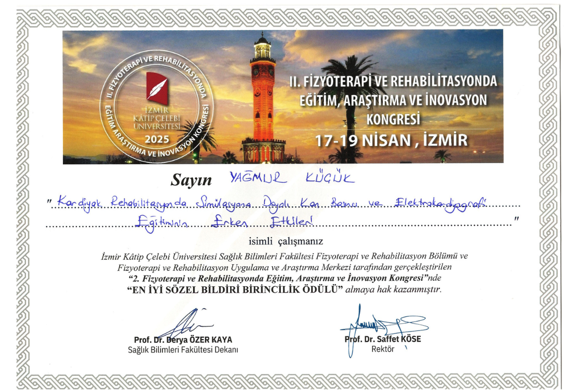 The study titled “Early Effects of Simulation-Based Blood Pressure and Electrocardiography Training in Cardiac Rehabilitation”, conducted under the supervision of Prof. Dr. Sema Savcı, faculty member of the Department of Physiotherapy and Rehabilitation at the Faculty of Health Sciences, and prepared by research assistants Dilek Çağrı Arslan, Meryem Bektaş Karakuş, Özge Haklı, Yağmur Küçük, and Hatice Kübra Gün, was awarded the First Prize for Best Oral Presentation at the congress.