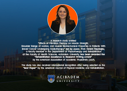 A research study entitled “Effects of Vibration Therapy on Muscle Strength, Shoulder Range of Motion, and Muscle Biomechanical Properties in Patients With Breast Cancer Undergoing Radiotherapy” led by Assoc. Prof. Özlem Feyzioğlu, a faculty member in the Department of Physiotherapy and Rehabilitation at the Faculty of Health Sciences, Acıbadem University, has been awarded the “Rehabilitation Excellence in Research Writing Award” by the American Association of Academic Physiatrists (AAP).