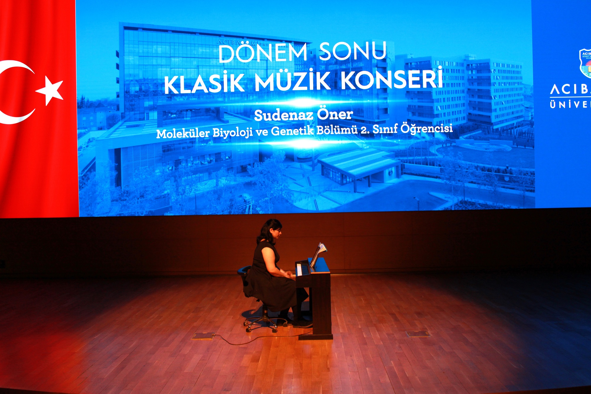Acıbadem University's 2023-2024 academic year concluded with the "End-of-Term Classical Music Concert" on June 7, 2024. The piano performance by Sudenaz Oner, a second-year student in the Department of Molecular Biology and Genetics at the Faculty of Engineering and Natural Sciences, received prolonged applause from our university members and students.