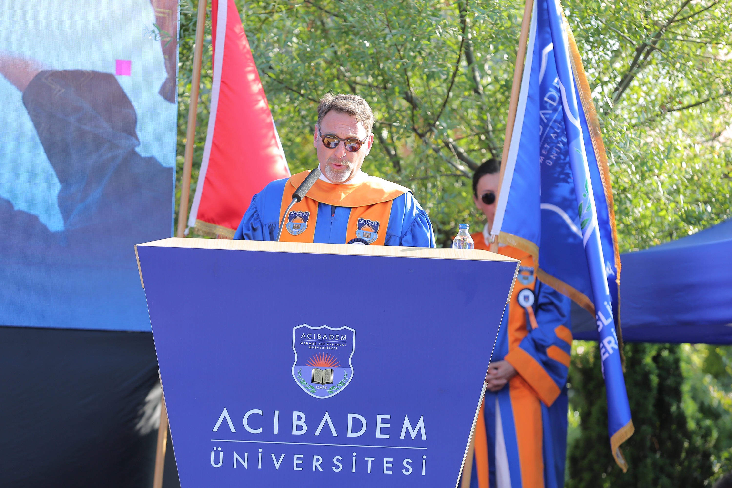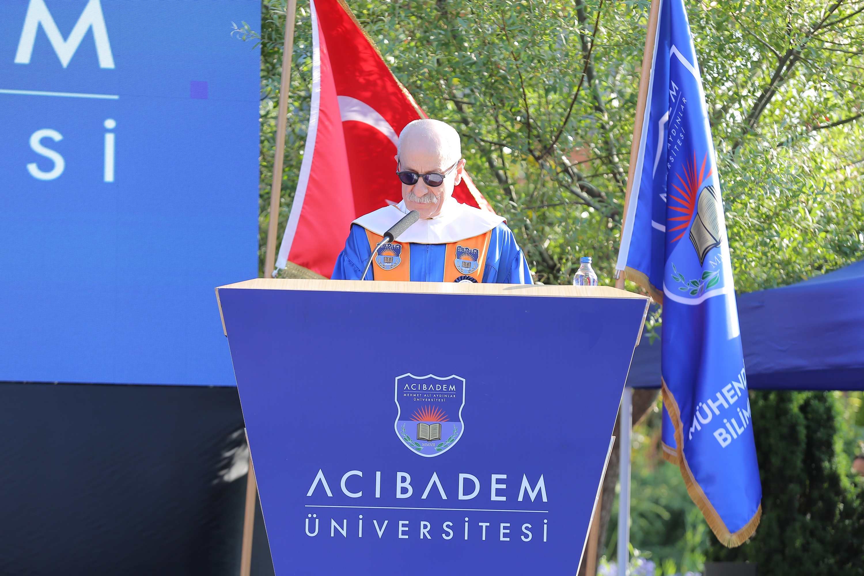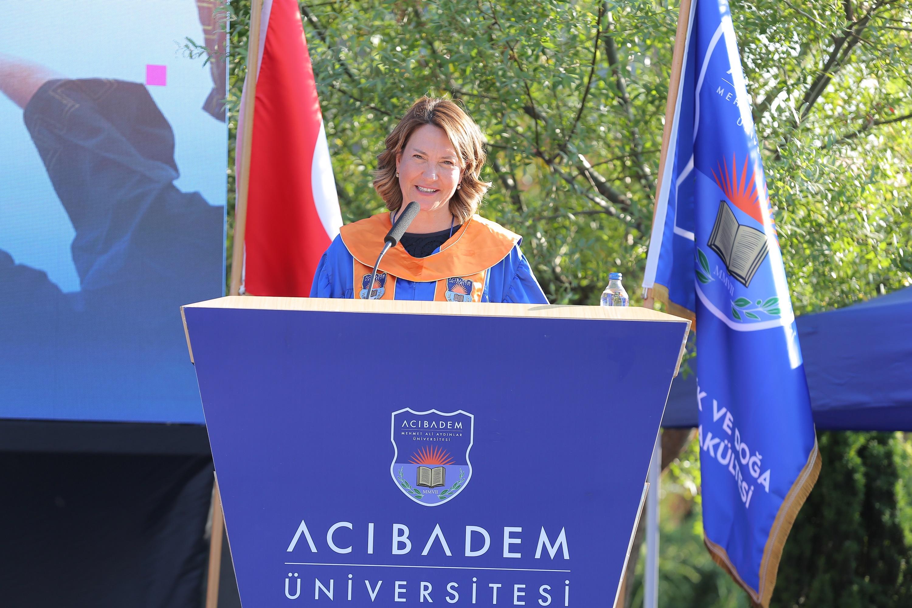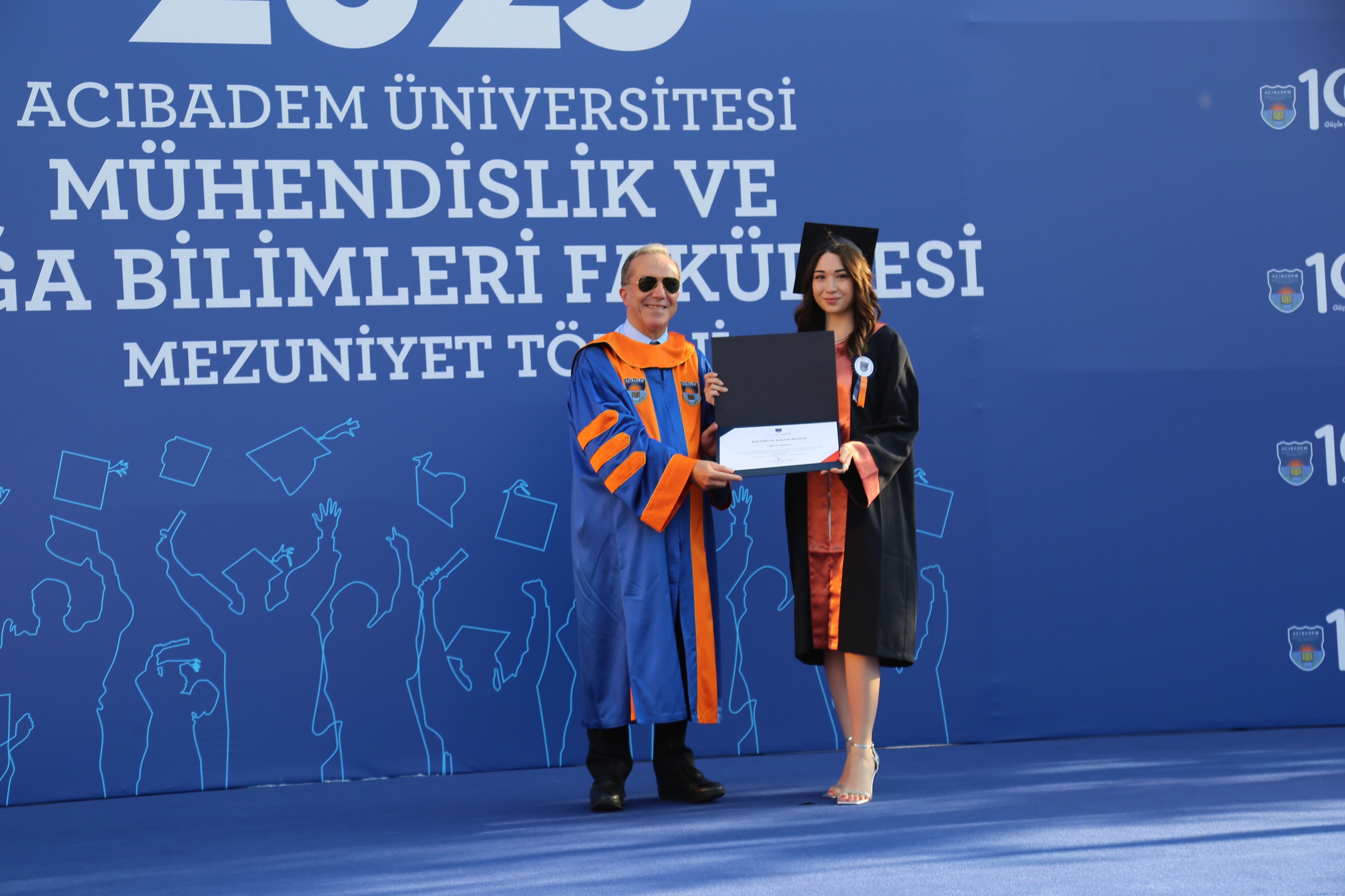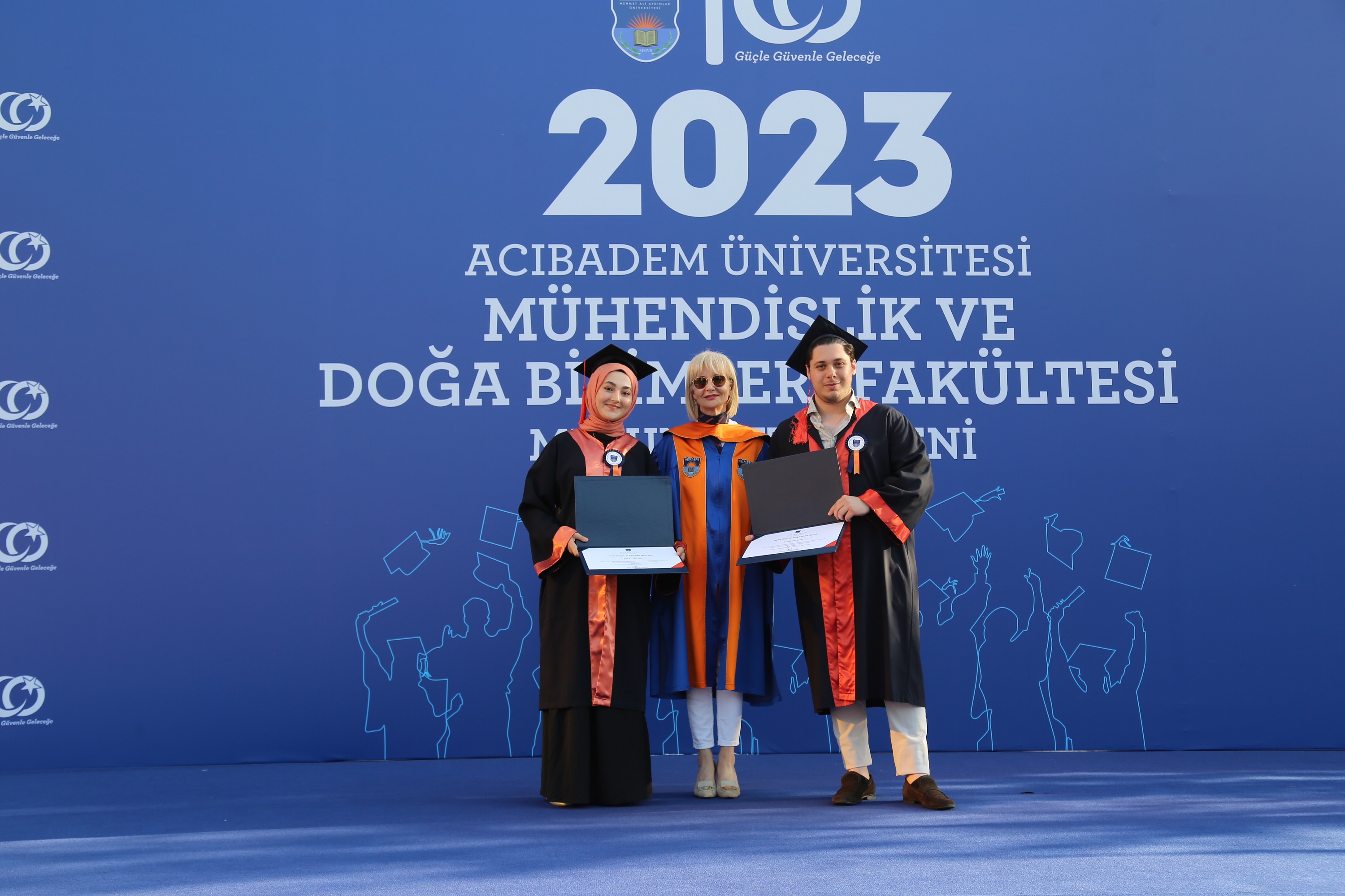 During the ceremony, Ozge Cetin, the top-ranking student of the Department of Molecular Biology and Genetics, represented her department with an inspiring speech. Ozge Cetin, along with Aybuke Irem Dalkıran, the top-ranking student of the Department of Medical Engineering, was honored with the Outstanding Achievement Certificate from the Board of Trustees. This prestigious certificate was presented to them by our Board of Trustees Chairman, Mehmet Ali Aydinlar, and our Board of Trustees Member, Seher Aydinlar, who is also the President of the Kerem Aydinlar Foundation.