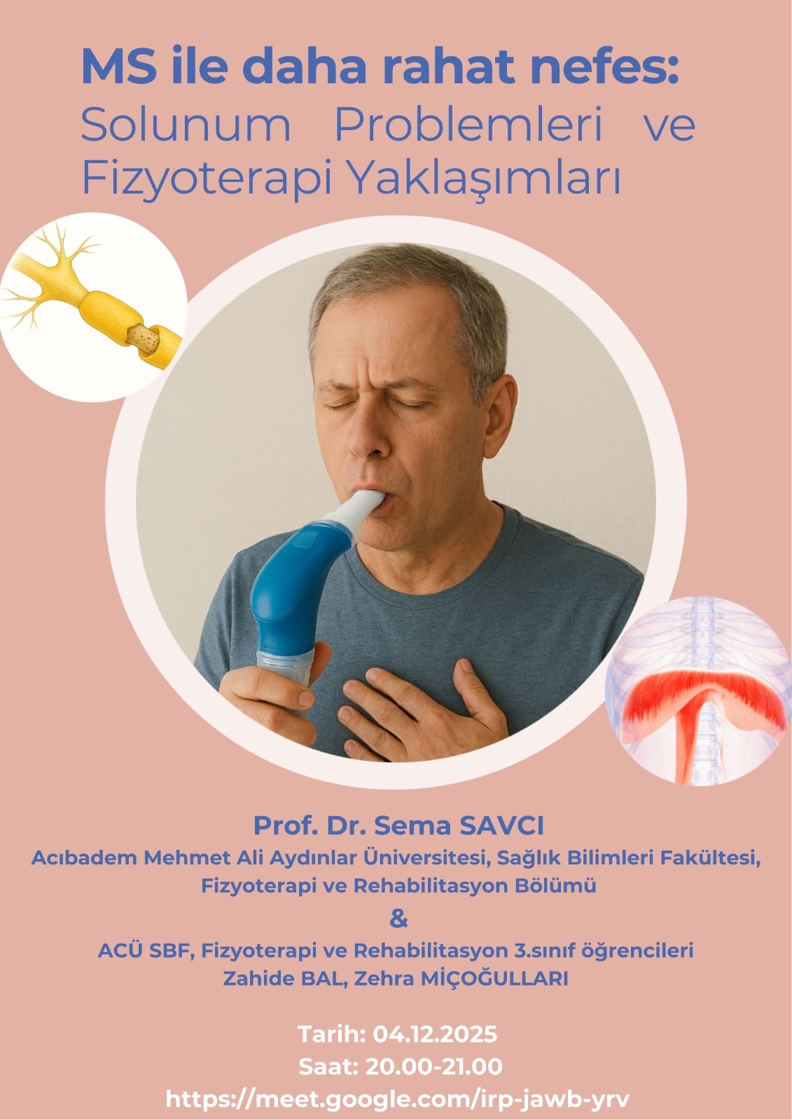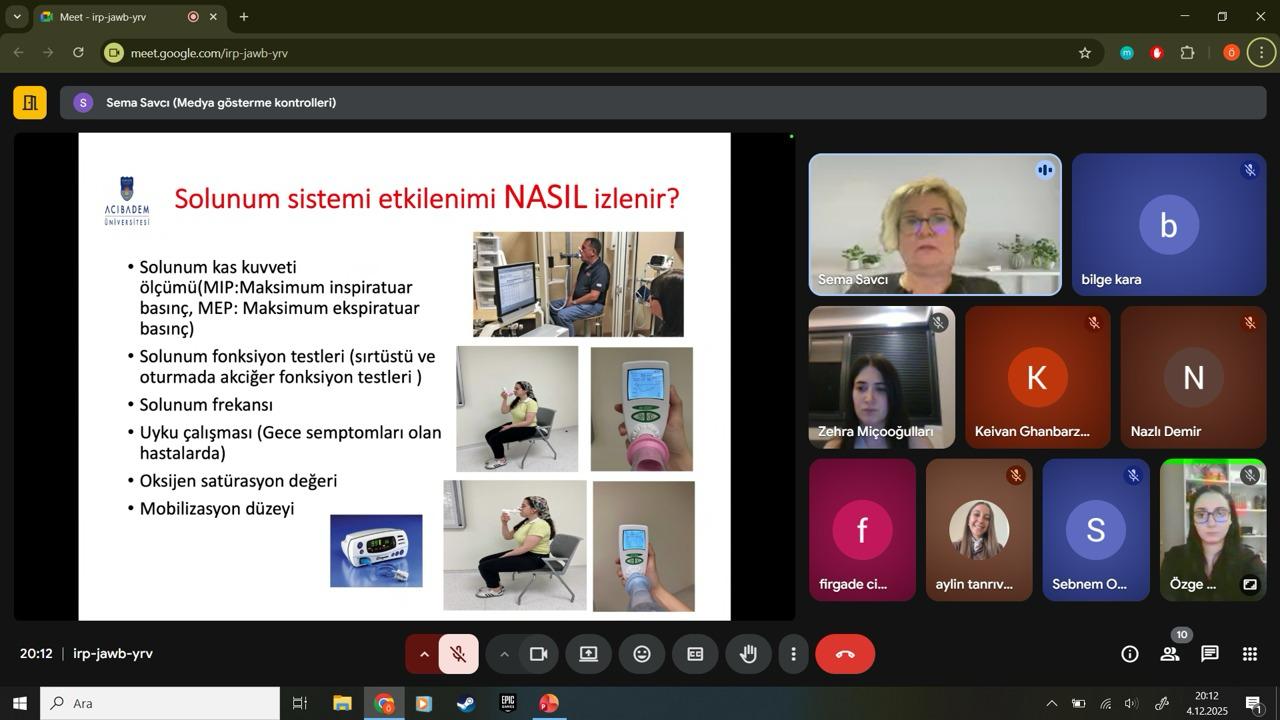 Acıbadem University Faculty of Physiotherapy and Rehabilitation organized the online event “Breathe Easier with MS: Respiratory Issues and Physiotherapy Approaches” on December 4, 2025, in collaboration with the İzmir MS Association. The event, presented by Prof. Dr. Sema Savcı, aimed to raise awareness about the early recognition of respiratory problems and physiotherapy approaches in individuals with MS.