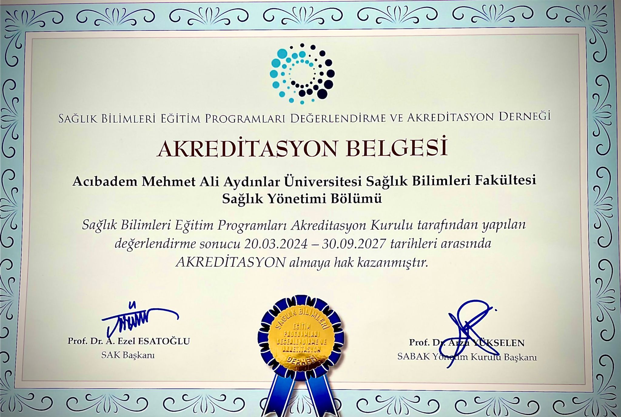 Our Faculty of Health Sciences' Health Management Undergraduate Program has been reaccredited by the Association for Evaluation and Accreditation of Health Sciences Education Programs (SABAK) for a period of three years, valid until September 30, 2027. The accreditation certificate from SABAK, authorized by the Higher Education Quality Council of Turkey, demonstrates that the Health Management Undergraduate Program meets the required success and quality standards to achieve its expected goals according to national and international criteria.