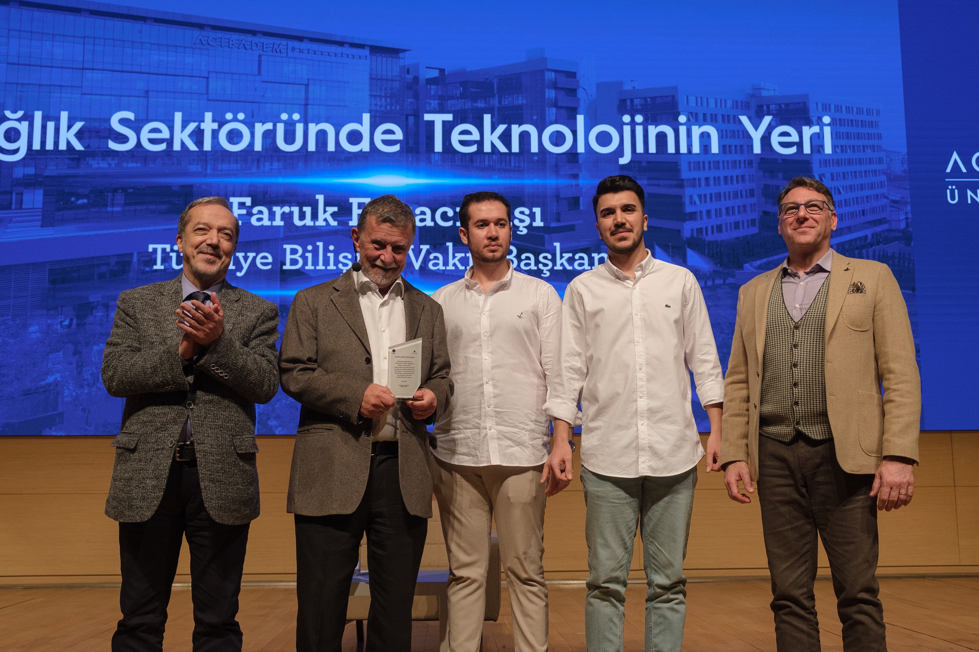 The event titled "Role of Technology in the Health Sector", organized by the Acibadem University Informatics Club, was held on March 11, 2023, in the university's conference hall. Faruk Eczacibasi, President of the Turkish Informatics Foundation and Vice Chairman of the Board of Eczacibasi Holding, was welcomed as a speaker. Before the conference, Eczacibasi visited and inspected the Acibadem University Technology Development Center (TEKMER). In his speech, Eczacibasi shared his views and experiences on updating oneself and making a difference in the face of technological advancements, especially in the health sector and beyond.