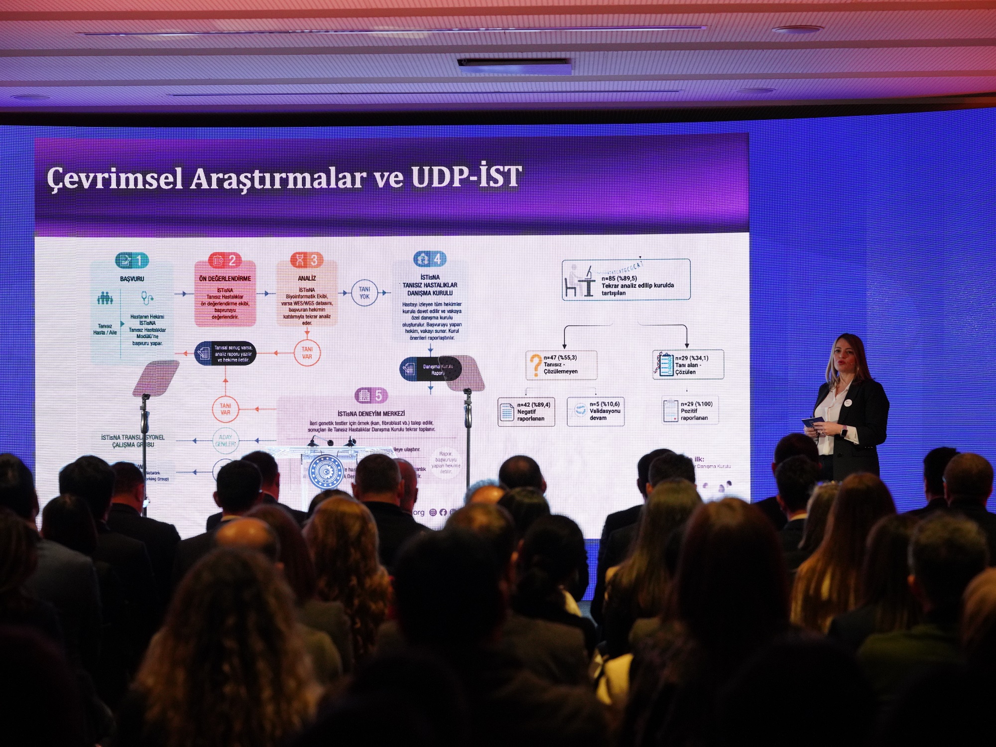 The ceremony started with a moment of silence and the national anthem, followed by the launch video presentation of the ISTisNA Project, which is conducted under the leadership of our University in partnership with Istanbul University and supported by the Istanbul Development Agency (ISTKA). After the presentation, the project leader and the Head of the Medical Biology Department of our Faculty of Medicine, Prof. Özden Hatırnaz Ng, delivered a presentation on the "ISTisNA Project Future Projection," discussing the project's vision and future. The project contributes socially by empowering patients and their relatives, increasing awareness in the field of rare diseases, and training competent scientists and healthcare professionals. It also supports research activities in this field through a biobank, cyclic research, and an undiagnosed patient program.