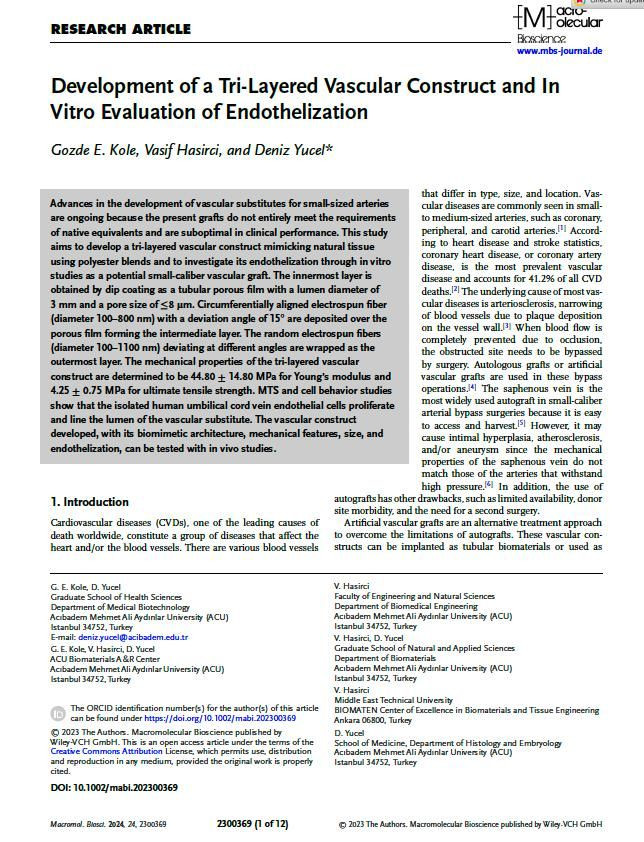 We are thrilled to announce that our latest research article, "Development of a Tri-Layered Vascular Construct and In Vitro Evaluation of Endothelization," has been published as an open access article in the peer-reviewed journal Macromolecular Science and featured on the back cover.