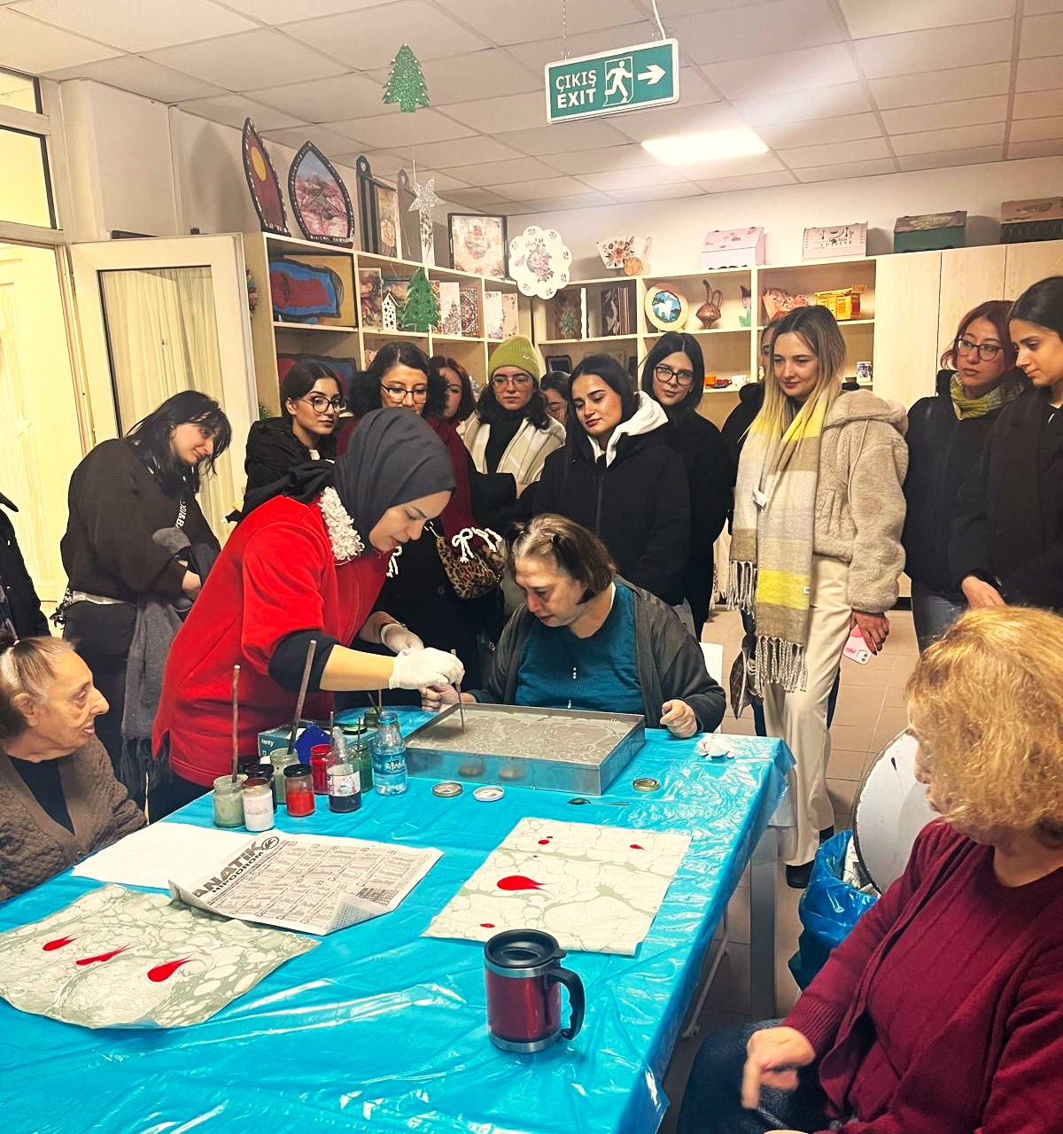 During the visit, a warm and sincere communication environment was established with the residents of Darülaceze. Through mutual conversations and sharing, a heartfelt gathering took place. As part of the event, students and academic staff participated in marbling (ebru) art, wood painting, and various handicraft activities together with the participants. These activities supported the active participation of elderly individuals and contributed to strengthening their motor, cognitive, and emotional processes.