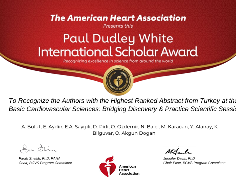 The study titled “A Novel Variant in GNB2 as a Cause of Sick Sinus Syndrome”, conducted by Aybike Bulut and Eylül Aydın, PhD students of the Translational Medicine Program, together with fourth-year Medical Faculty students Eyüp Alper Saygılı and Doğukan Pirli, under the supervision of Assoc. Prof. Özlem Akgün Doğan and Asst. Prof. Kaya Bilgüvar from the Department of Medical Genetics, and with the contribution of the ACURARE research group, has been granted the American Heart Association Paul Dudley White International Scholar Award.