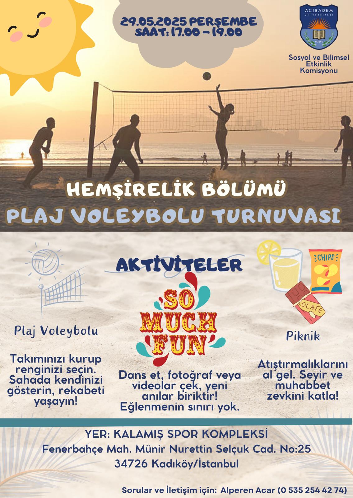 The “Beach Volleyball Tournament” organized by the Social and Scientific Activities Commission of the Acıbadem University Department of Nursing was held on May 29, 2025, at the Kalamış Sports Complex. The main aim of the event was to enhance social interaction among students and promote teamwork.