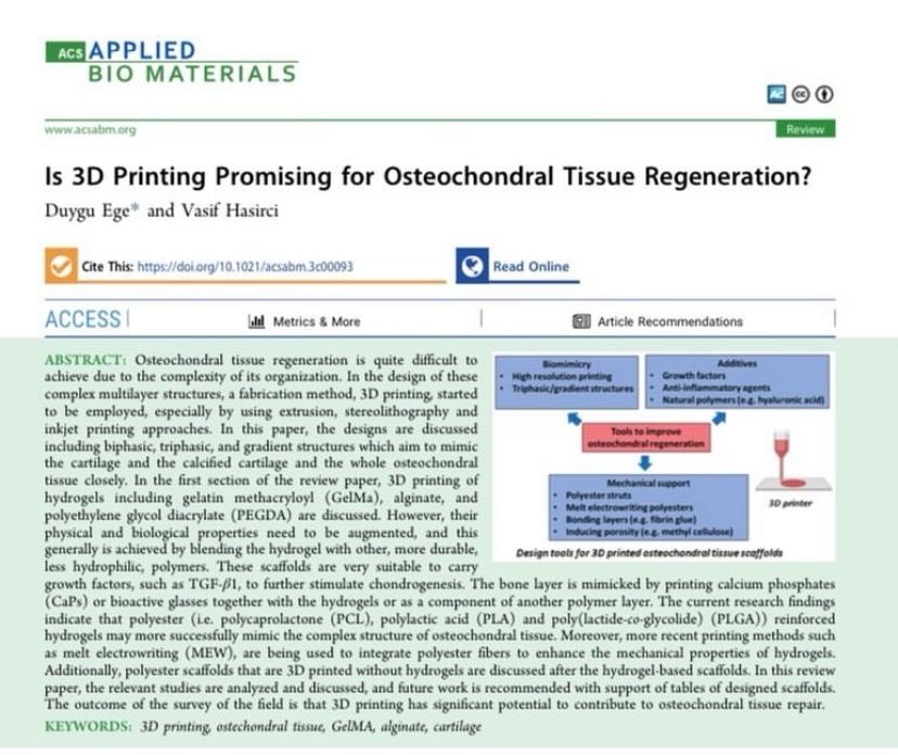 Our center's new article has been published. Is 3D Printing Promising for Osteochondral Tissue Regeneration?