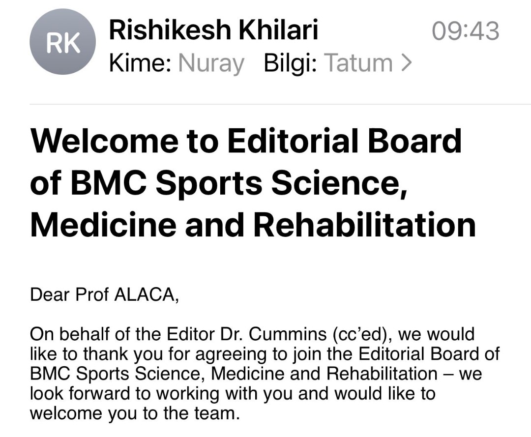 Assoc. Prof. Nuray Alaca, a faculty member of the Department of Physiotherapy and Rehabilitation at Acıbadem University's Faculty of Health Sciences, was appointed to the editorial board of BMC Sports Science, Medicine and Rehabilitation. This open-access, peer-reviewed journal evaluates articles covering all aspects of sports medicine and exercise sciences, including rehabilitation, traumatology, cardiology, physiology, and nutrition.