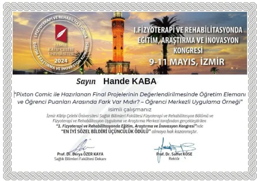 At the 1st Congress on Education, Research, and Innovation in Physiotherapy and Rehabilitation, organized by Izmir Katip Celebi University’s Department of Physiotherapy and Rehabilitation from May 9-11, Dr. Hande Kaba from the Department of Physiotherapy and Rehabilitation at Acibadem University's Faculty of Health Sciences was honored with the Third Place Award for Best Oral Presentation with her "Is There a Difference Between Instructor and Student Scores in the Evaluation of Final Projects Prepared with Pixton Comic?- A Student-Centered Application Example," work.