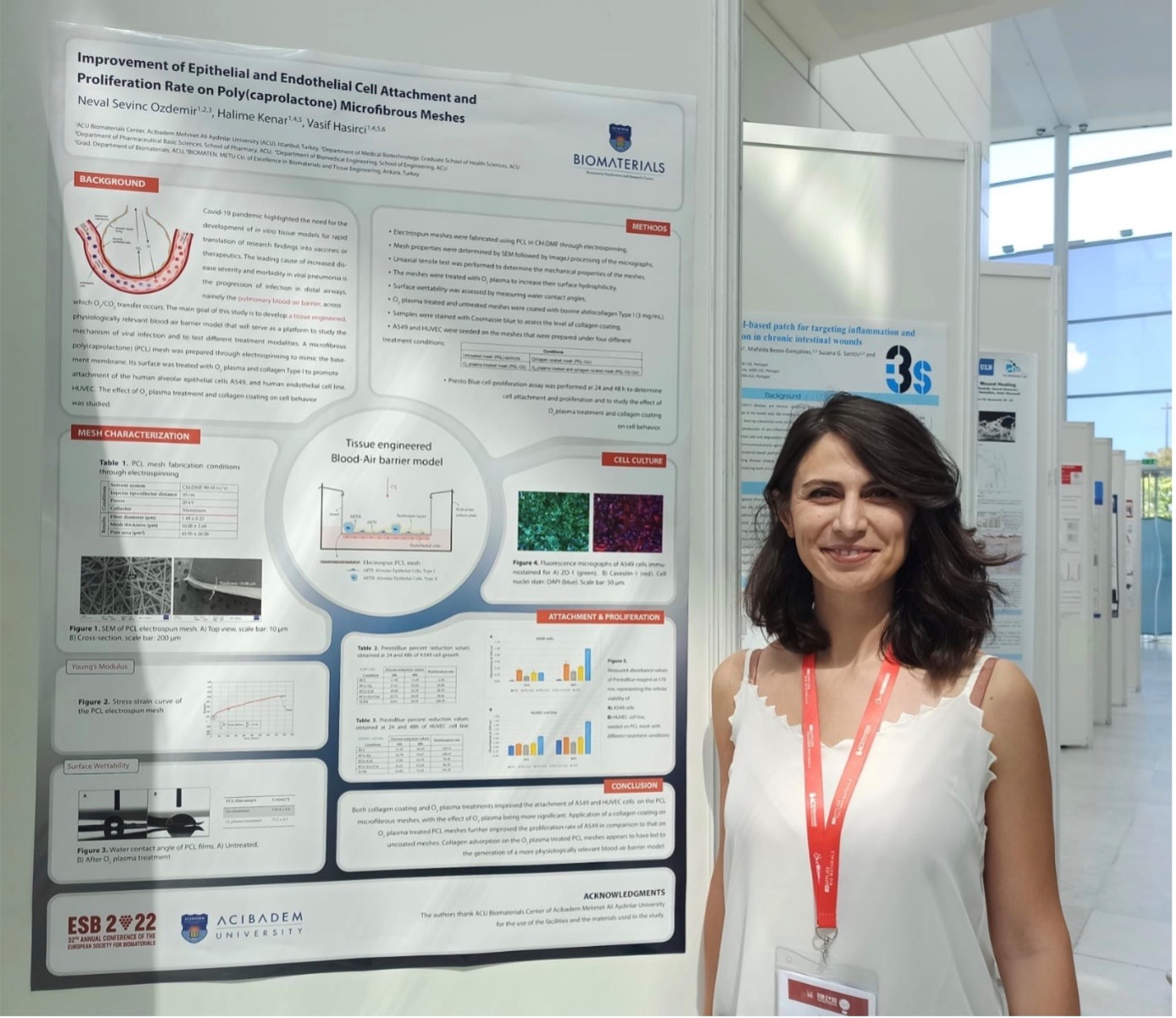 Neval Sevinc Ozdemir, a PhD student at ACU Biomaterials presented her results at #ESB2022 as a poster “Improvement of Epithelial and Endothelial Cell Attachment and Profliferation Rate on Poly(caprolactone) Microfibrous Meshes”.