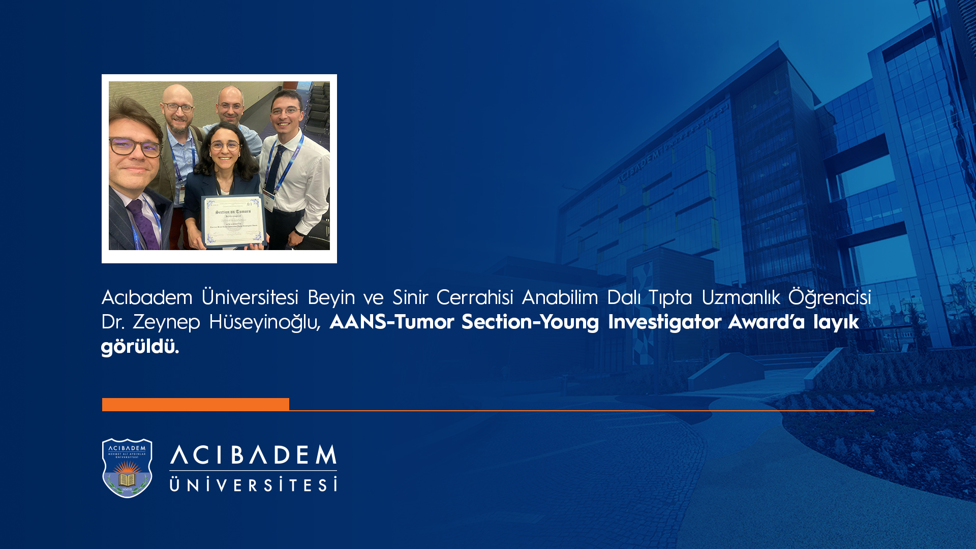 Dr. Zeynep Hüseyinoğlu, a resident doctor in the Department of Neurosurgery at our University, has been awarded the Tumor Section - Young Investigator Award at the AANS 2025 Scientific Congress for her presentation titled “A Spatial Molecular Analysis of the Sarcomatous Component in Gliosarcomas.”