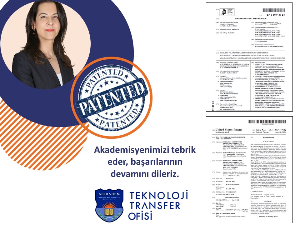 Our faculty member, from the Department of Medical Biotechnology at the Institute of Health Sciences, Prof. Meltem MUFTUOGLU received patent registration in the USA and Europe for her invention titled "Novel DNA Polymerase Gamma Inhibitor and Uses Thereof”.