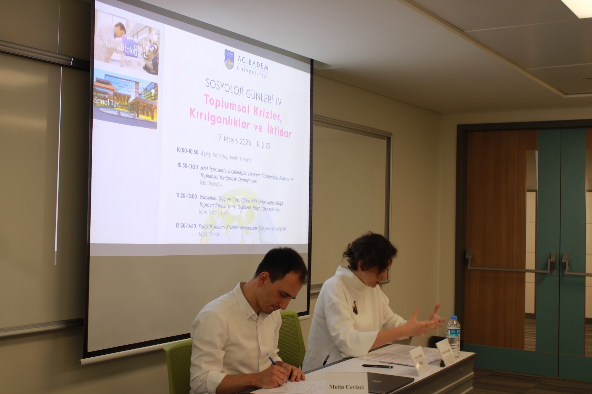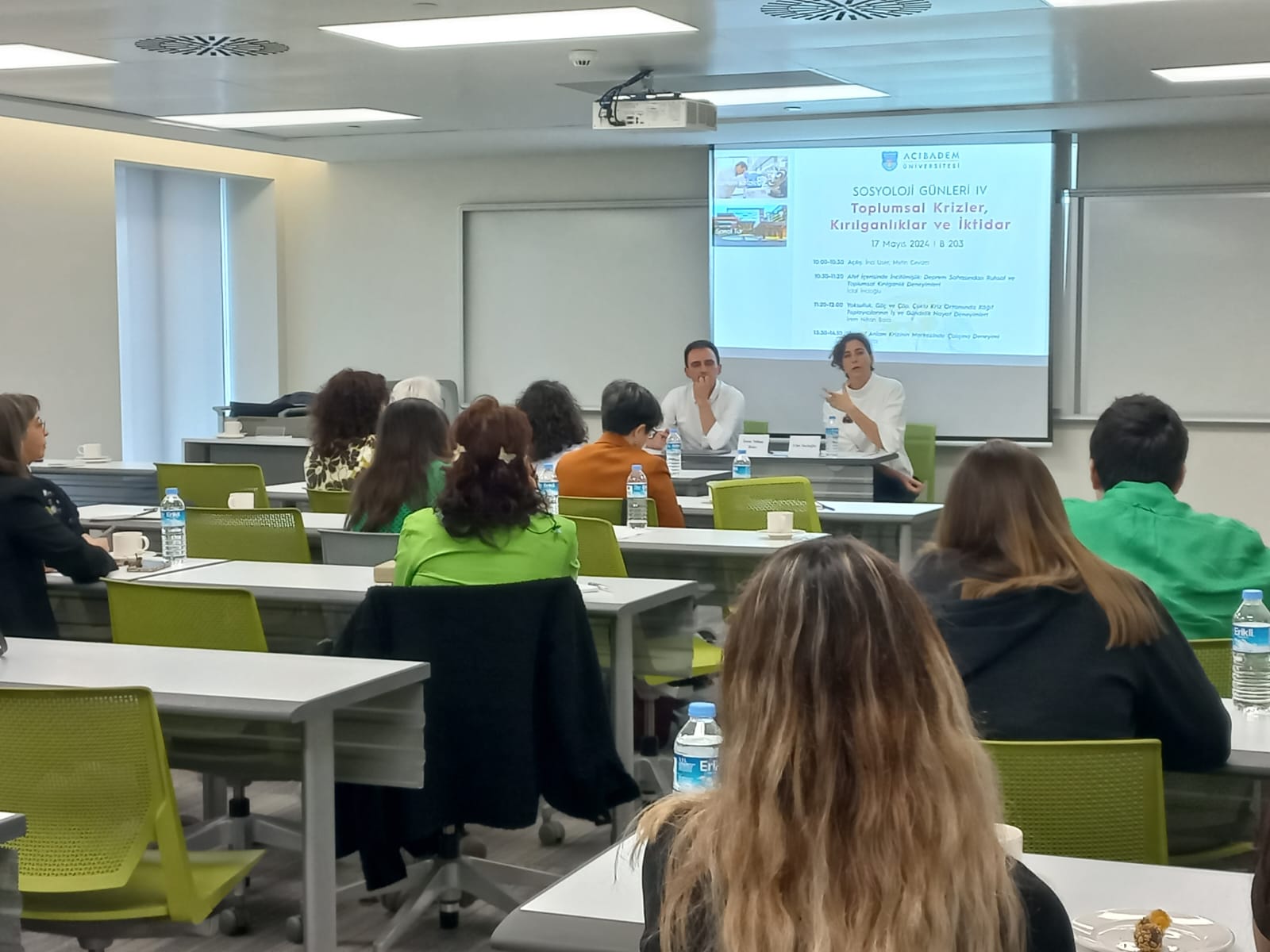 The event "Sociology Days IV: Social Crises, Vulnerabilities, and Power," organized by the Department of Sociology within the Faculty of Humanities and Social Sciences at Acıbadem University, occurred on May 17, 2024. The event featured discussions on the experiences of vulnerabilities produced by crises in various social groups and areas of power, with participation from five speakers and 43 attendees. Topics included disaster survivor experiences, the relationship between the waste economy and social stratification in Turkey, white-collar experiences in the workplace, prosecutors' professional experiences in legal processes, and the impact of educational policies on teachers and parents.