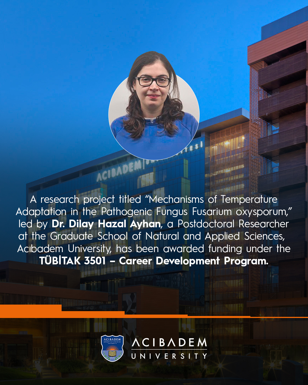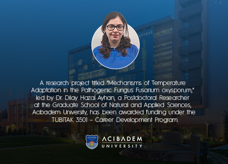 A research project titled “Mechanisms of Temperature Adaptation in the Pathogenic Fungus Fusarium oxysporum,” led by Dr. Dilay Hazal Ayhan, a Postdoctoral Researcher at the Graduate School of Natural and Applied Sciences, Acıbadem University, has been awarded funding under the TÜBİTAK 3501 – Career Development Program.