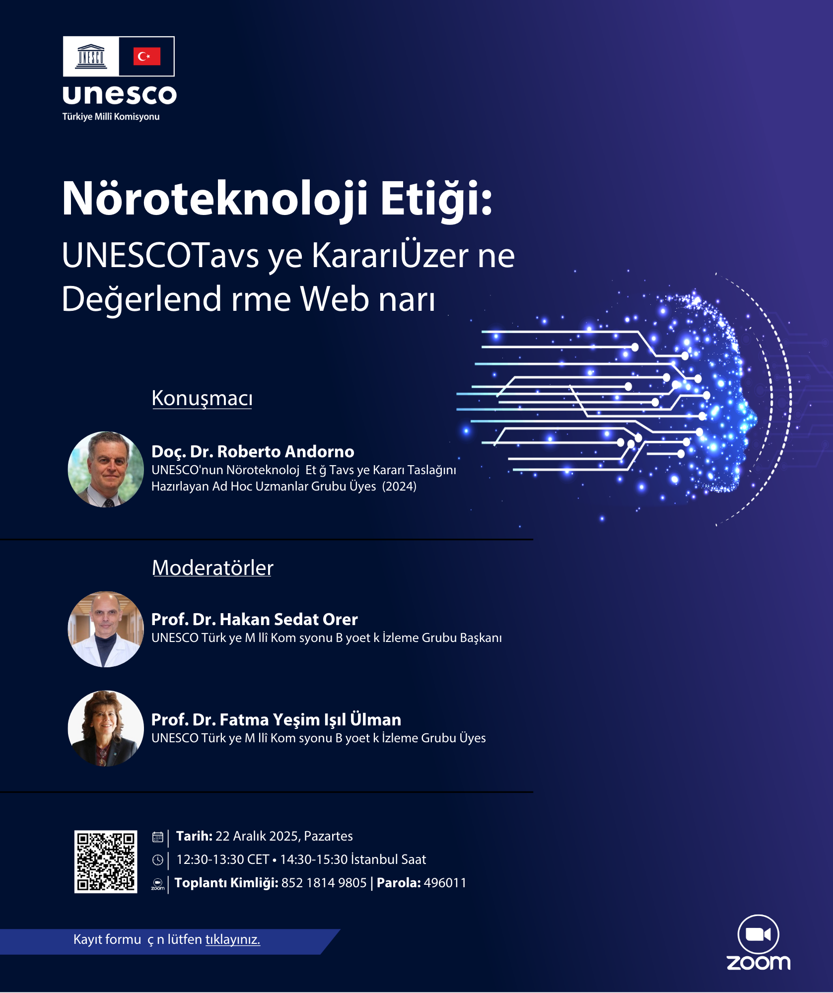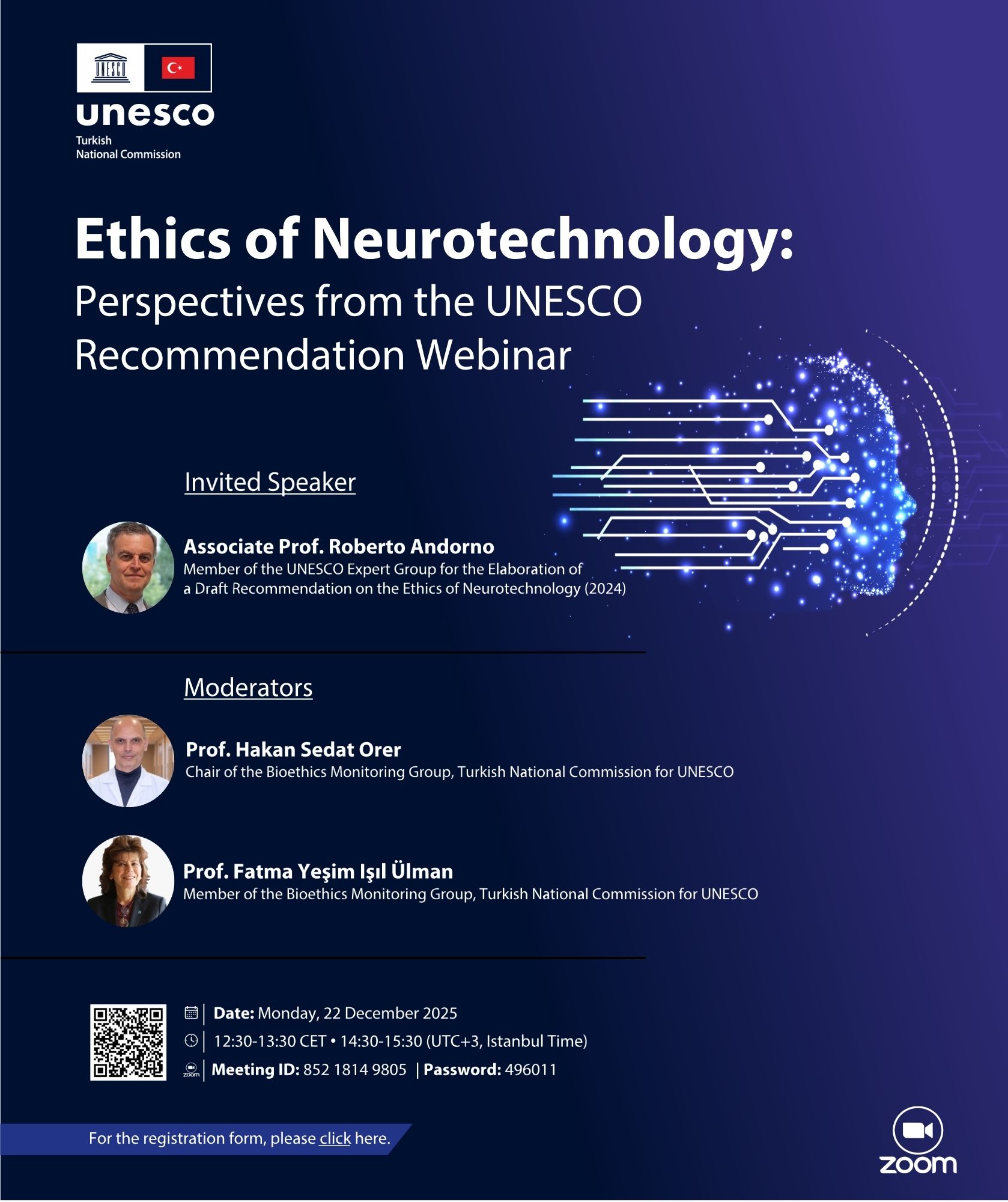 Prof. Andorno concluded that Neurotechnologies have great potential to improve the well-being of neurological patients by providing new diagnostic, preventive, and therapeutic tools. However, these same technologies open the door to unprecedented threats to the core of human personhood, to self- determination, freedom of thought, and mental privacy. The UNESCO Recommendation on the ethics of neurotechnology represents a valuable step by the international community towards ensuring a responsible use of these new technological powers. It is now up to the states to adopt specific legislative measures at the domestic level to implement the values and principles set out in the Recommendation. The webinar ended with Q&As by the audience, international colleagues from diverse disciplines, the members of the Bioethics Group, Profs Hakan Orer, Uygar Tazebay, Ozge Yucel and Yesim Isil Ulman. (UNESCO Recommendation on the Ethics of Neurotechnology, November 2025 https://www.unesco.org/en/ethics-neurotech/recommendation)
