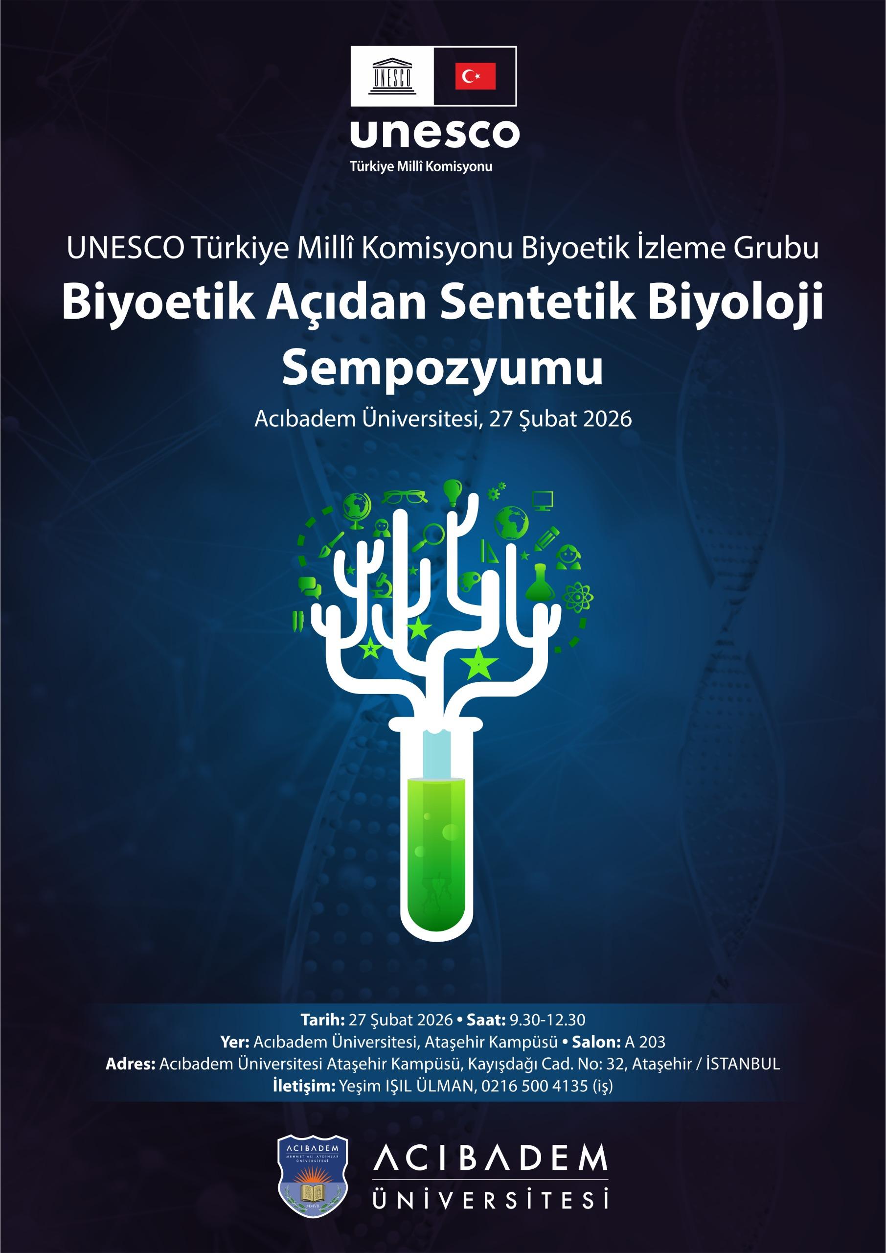 UNESCO Türkiye Ulusal Komisyonu Biyoetik İzleme Grubu ile Acıbadem Üniversitesi Tıp Fakültesi Tıp Tarihi ve Etik Anabilim Dalı iş birliğinde düzenlenen “Biyoetik Perspektifinden Sentetik Biyolojideki Yeni Gelişmeler Sempozyumu”, 27 Şubat 2026 tarihinde Acıbadem Üniversitesi Ataşehir Kampüsü’nde gerçekleştirilecek. Sempozyum tüm ilgililere açıktır.