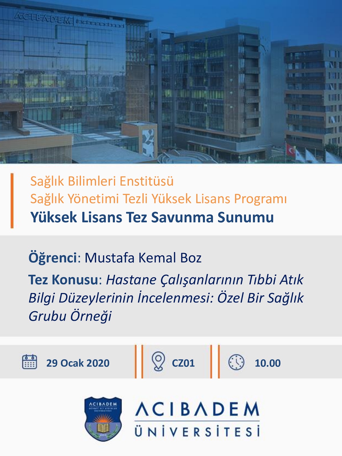 SBE Sağlık Yönetimi Tezli Yüksek Lisans Programı Yüksek Lisans Tez Savunma SunumuÖğrenci: Mustafa Kemal BozTez Konusu: Hastane Çalışanlarının Tıbbi Atık Bilgi Düzeylerinin İncelenmesi: Özel Bir Sağlık Grubu Örneği