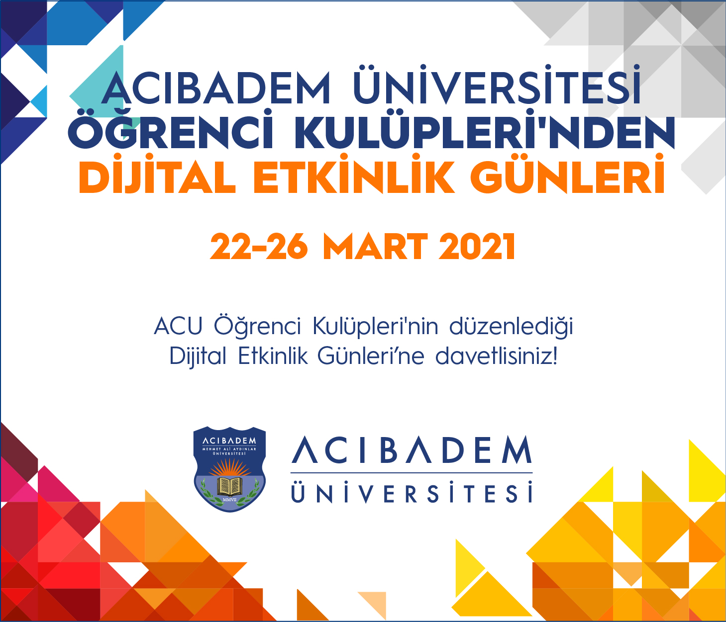 ACU Öğrenci Kulüpleri tarafından düzenlenen “Dijital Etkinlik Günleri” 22-26 Mart 2021 tarihleri arasında gerçekleşti.Pandemi koşulları nedeniyle birbirlerinden uzak kalan öğrencilerimiz kulüp etkinlikleri ile bir araya geldi. Hafta boyunca kulüpler zoom üzerinden birbirinden farklı ve eğlenceli etkinlikle gerçekleştirdi. Etkinlik duyuruları hem üniversitemizin hem de öğrenci kulüplerimizin sosyal medya hesaplarından da paylaşıldı.