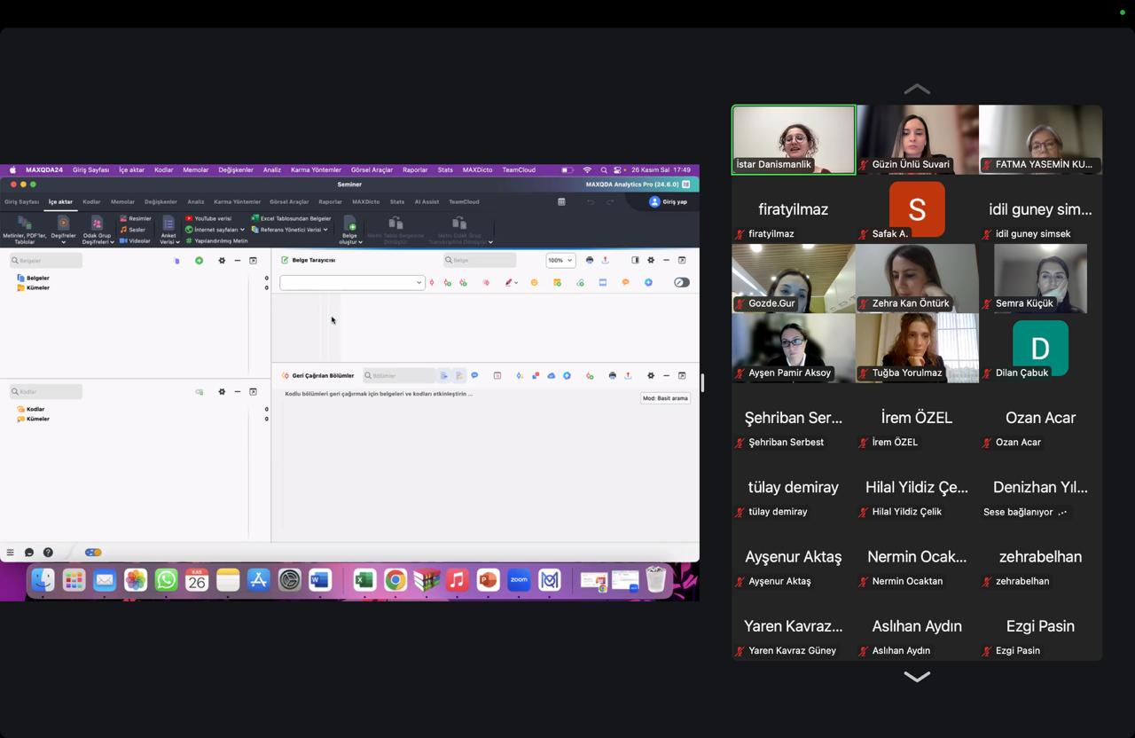 Acıbadem Üniversitesi Sağlık Bilimleri Fakültesi Hemşirelik Bölümü tarafından ev sahipliği yapılan "MAXQDA ile Yapay Zeka Destekli Nitel Veri Analizi Eğitimi" etkinliği, üniversitenin Sosyal ve Bilimsel Etkinlik Komisyonu tarafından düzenlendi. 26 Kasım 2024 Çevrimiçi olarak gerçekleştirilen eğitim, katılımcılara nitel verilerin MAXQDA yazılımı kullanılarak nasıl analiz edileceği konusunda bilgi ve beceri kazandırmayı amaçladı. Eğitimde, nitel veri analizi süreçlerinin çeşitli aşamaları, görselleştirme ve raporlama adımları uygulamalı örneklerle anlatıldı. Katılımcılara, verilerin MAXQDA programına aktarılması, kod oluşturma, değişken atama gibi temel işlemler gösterildi. Ayrıca, kodlayıcılar arası uzlaşma süreçleri, MaxDicto işlevleriyle yapılan metin ve tematik analizler detaylı bir şekilde ele alındı. Betimsel, karşılaştırmalı ve ilişkisel analiz yöntemlerinin de uygulamalı olarak tanıtıldığı eğitim, katılımcılara teorik bilgileri pratikle buluşturma fırsatı sundu. Eğitim, İSTAR Araştırma’nın kurucu ortaklarından ve MAXQDA profesyonel eğitmeni Fırat Yılmaz’ın açılış konuşmasıyla başladı. Ardından, Şeyma Poyrazoğlu'nun liderliğinde, MAXQDA'nın yapay zeka destekli yenilikçi özellikleri katılımcılara tanıtıldı. Eğitmenler, katılımcıların sorularını yanıtlayarak, programı etkin bir şekilde kullanabilmeleri için çözüm odaklı yaklaşım ve destek sundu. Eğitim, katılımcıların sorularını sorduğu ve öğrendiklerini pekiştirdiği interaktif bir oturumla sona erdi. Eğitim, katılımcıların nitel veri analizi konusundaki bilgi seviyelerini artırmalarının yanı sıra, MAXQDA programını etkin bir şekilde kullanma becerilerini de geliştirdi.