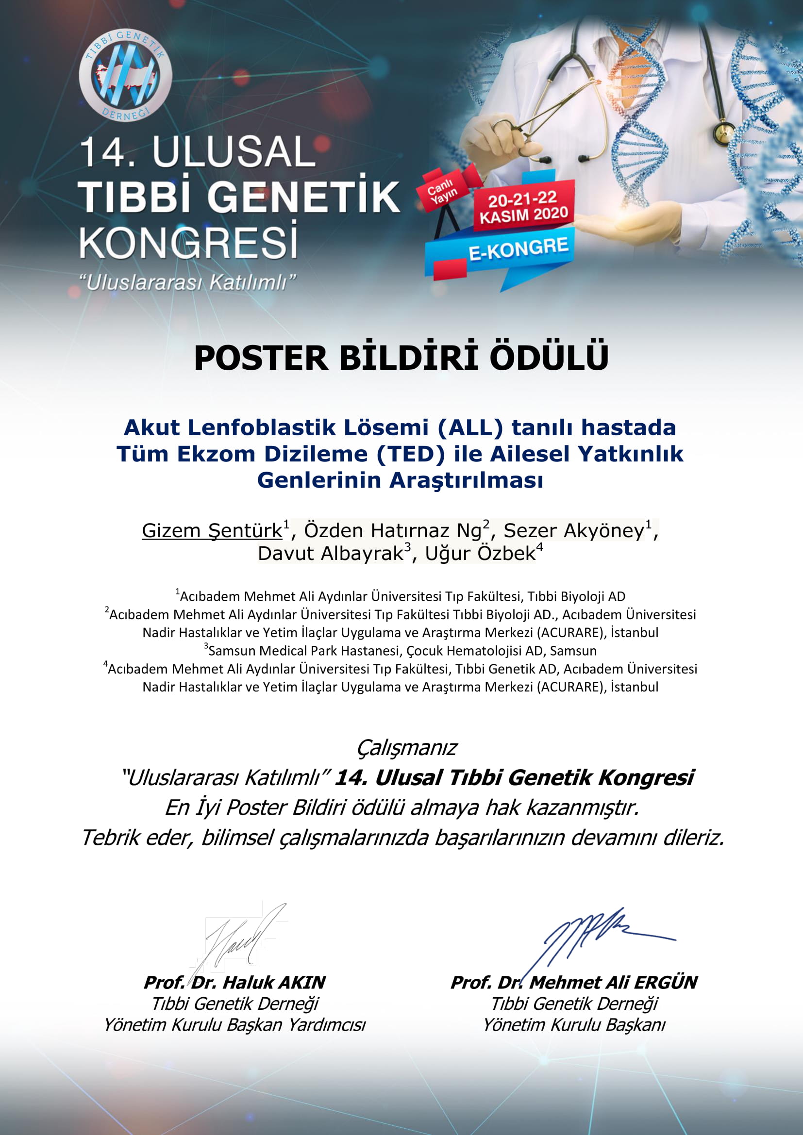Üniversitemiz Tıp Fakültesi Tıbbi Biyoloji Anabilim Dalı Öğretim Üyesi Özden Hatırnaz Ng’nin danışmanlığında, doktora öğrencisi Gizem Şentürk’ün tez çalışması kapsamında ACURARE ekibi olarak gerçekleştirilen “Akut Lenfoblastik Lösemi (ALL) tanılı hastada Tüm Ekzom Dizileme (TED) ile Ailesel Yatkınlık Genlerinin Araştırılması” başlıklı poster sunumu 14. Ulusal Tıbbi Genetik Kongresi’nde En İyi Poster Bildiri Ödülü kazandı.