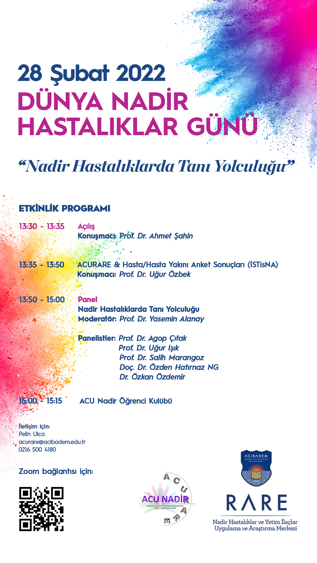 Acıbadem Üniversitesi Nadir Hastalıklar ve Yetim İlaçlar Uygulama ve Araştırma Merkezi (ACURARE) tarafından düzenlenen “Nadir Hastalıklarda Tanı Yolculuğu” başlıklı Dünya Nadir Hastalıklar Günü Paneli 28 Şubat 2022 tarihinde ACURARE Müdürü ve Üniversitemiz Tıp Fakültesi Tıbbi Genetik Anabilim Dalı Başkanı Prof. Dr. Uğur Özbek’in açılış konuşmasıyla başladı. Moderatörlüğünü ACURARE Yönetim Kurulu Üyesi ve Üniversitemiz Tıp Fakültesi Çocuk Sağlığı ve Hastalıkları Öğretim Üyesi Prof. Dr. Yasemin Alanay’ın yaptığı panelde, konuşmacı olarak Üniversitemiz Tıp Fakültesi Çocuk Sağlığı ve Hastalıkları Öğretim Üyeleri Prof. Dr. Agop Çıtak ve Prof. Dr. Uğur Işık, Üniversitemiz Tıp Fakültesi Ortopedi ve Travmatoloji Anabilim Dalı Öğretim Üyesi Prof. Dr. Salih Marangoz, ACURARE Müdür Yardımcısı ve Üniversitemiz Tıp Fakültesi Tıbbi Biyoloji Anabilim Dalı Öğretim Üyesi Doç. Dr. Özden Hatırnaz NG ve Üniversitemiz Sağlık Bilimleri Enstitüsü Genom Çalışmaları Yüksek Lisans Programı Öğr. Gör. Dr. Özkan Özdemir yer aldı. Hastaların ve hasta yakınlarının tanı sürecinde yaşadığı zorlukları ve tanı için gelişen laboratuvar tekniklerini ele alan konuşmacılar, kişilerin yaşamını tehdit eden veya kronik olarak engelli konuma sokan nadir hastalıklar hakkında katılımcıları bilgilendirdi. Nadir hastalıklarla ilgili farkındalık yaratmak amacıyla düzenlenen panelin sonunda Üniversitemiz Nadir Hastalıklar Kulübü de söz alarak, başta üniversitemiz olmak üzere toplumun tüm kesimlerinde nadir hastalıklar bilinci oluşturmak amacıyla düzenledikleri çeşitli etkinliklerden bahsetti. Ayrıca kulüp geçen sene başlattığı Nadir Müzik Projesi için hazırladığı klibi de yayınladı.