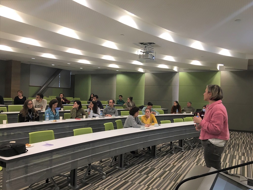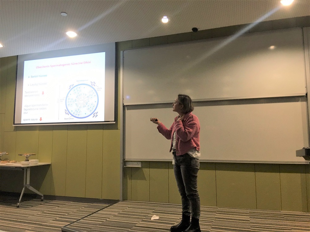 Tıp Fakültesi Temel Tıp Bilimleri Bölümü Histoloji ve Embriyoloji Anabilim Dalı Öğretim Üyesi Dr. Öğr. Üyesi Merve Açıkel Elmas’ın konuşmacı olduğu “Erkek Fertilitesinde Beslenme ve Egzersizin Rolü ” başlıklı etkinlik, 30 kişinin katılımıyla gerçekleşti. Obezite ve infertilite ile ilgili çalışmalar yürüten ve histoloji, histokimya, immünhistokimya, elektron mikroskopisi ve glikobiyoloji yöntemleri konusunda deneyim sahibi olan Dr. Merve Elmas, erkek fertilitesini etkileyen faktörler içerisinde yer alan beslenme ve egzersizin rolü ile ilgili bilgiler verdi.