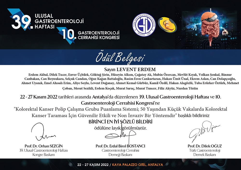 Üniversitemiz Tıp Fakültesi 2022 yılı mezunlarından Dr. Can Boynukara’nın; Prof. Dr. Nurdan Tözün, Prof. Dr. Murat Saruç ve Doç. Dr. Hakan Ünal ile birlikte katıldığı "Kolorektal Kanser Polip Çalışma Grubu Puanlama Sistemi; 50 Yaşından Küçük Vakalarda Kolorektal Kanser Taraması İçin Güvenilir Etkili ve Non İnvaziv Bir Yöntemdir" adlı çok merkezli çalışma 22 - 27 Kasım 2022 tarihleri arasında Antalya’da düzenlenen 39. Ulusal Gastroenteroloji Haftası ve 10. Gastroenteroloji Cerrahisi Kongresi’nde “Birinci En İyi Sözlü Bildiri” ödülüne layık görülmüştür.