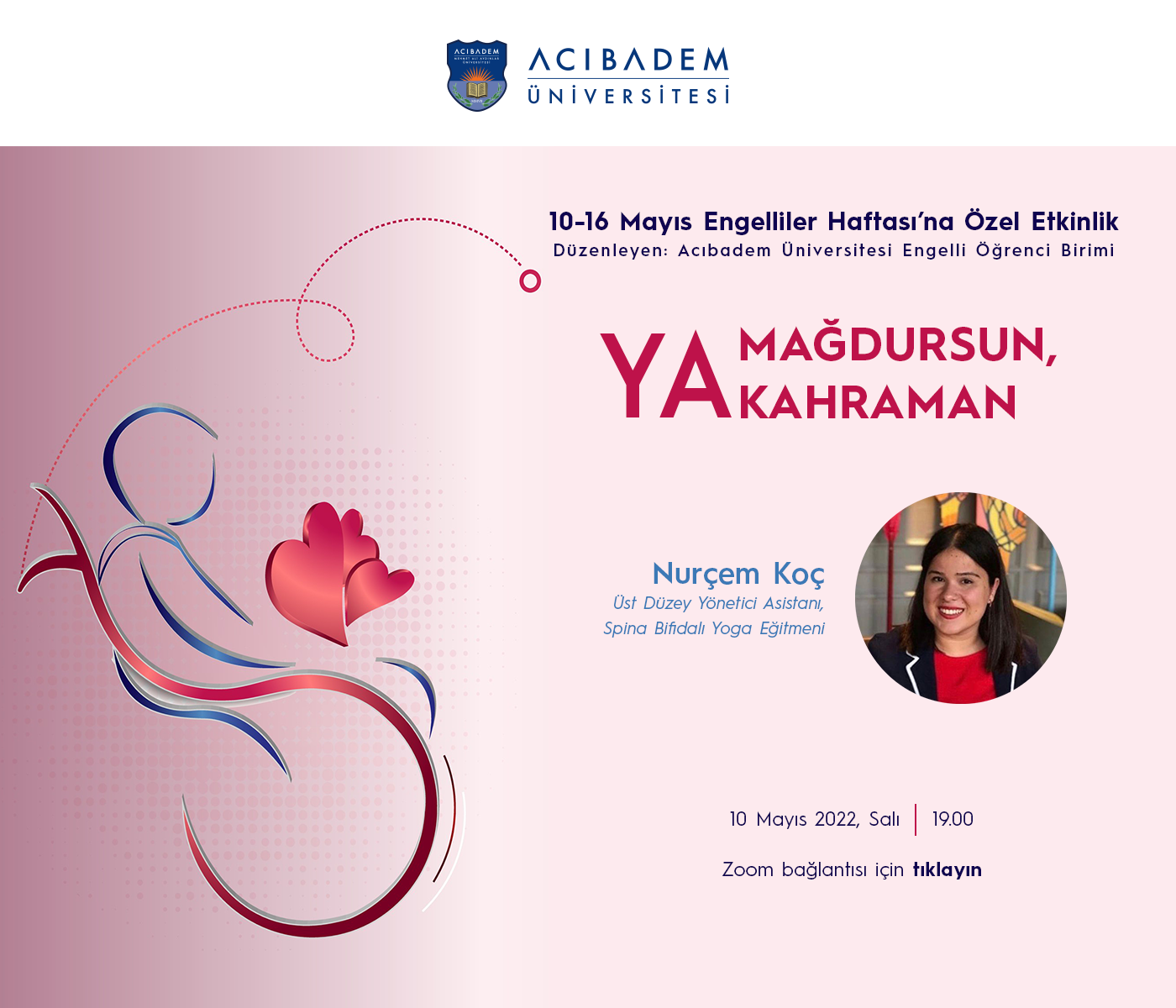 Üniversitemiz Engelli Öğrenci Birimi’nin engellilik konusunda farkındalık yaratmak amacıyla 10-16 Mayıs Engelliler Haftası’na özel düzenlediği “Ya Mağdursun, Ya Kahraman” başlıklı etkinlik, üst düzey yönetici asistanı ve Spina Bifidalı Yoga Eğitmeni Nurçem Koç’un katılımıyla 10 Mayıs 2022 tarihinde gerçekleşti.Engelli bireyin yaşam yolculuğunda yaşadıklarını ve tecrübelerini konu alan Nurçem Koç, çocukluk ve gençlik döneminde kendi yaşadıklarını ve tecrübelerini katılımcılarla paylaştı. Etkinlik, katılımcıların sorularının cevaplandırılmasıyla sona erdi.Tüm haberlere ulaşmak için tıklayın.