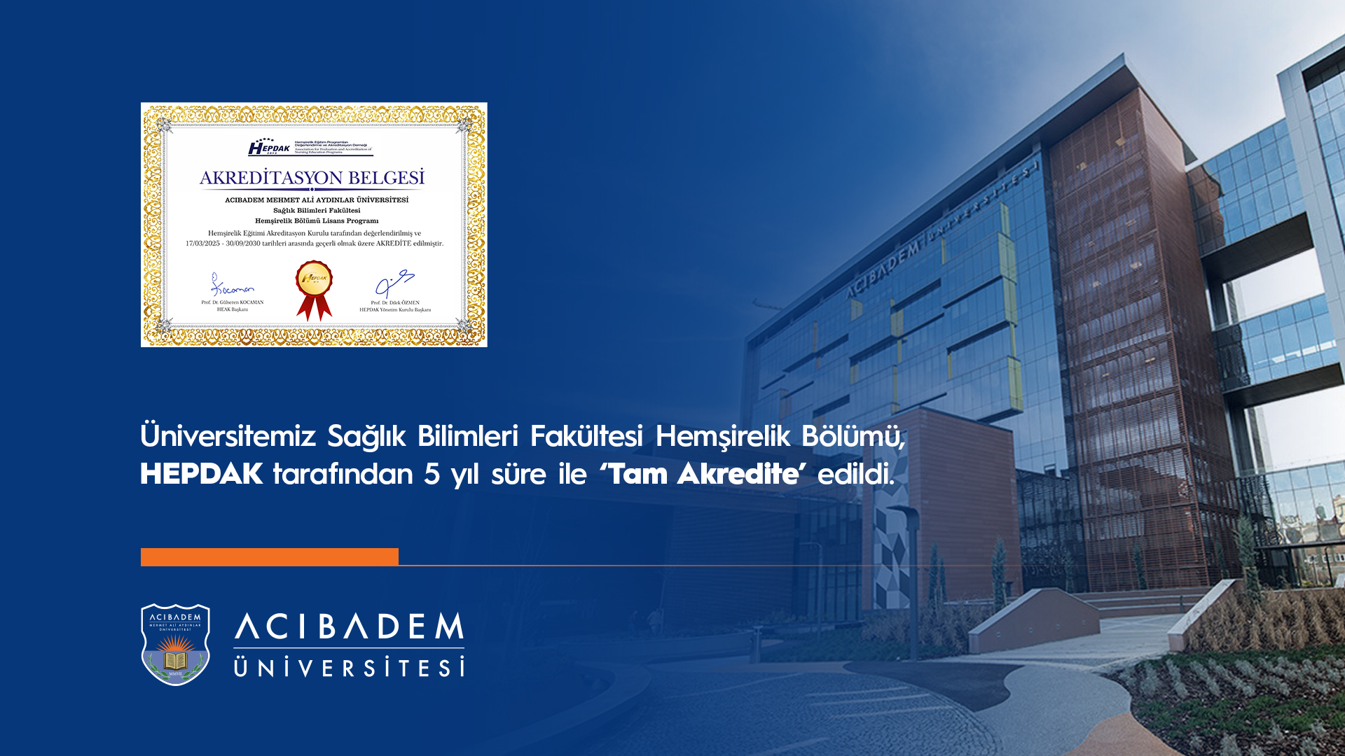 Acıbadem Mehmet Ali Aydınlar Üniversitesi Sağlık Bilimleri Fakültesi Hemşirelik Bölümü, Hemşirelik Eğitim Programları Değerlendirme ve Akreditasyon Derneği (HEPDAK) tarafından yapılan genel değerlendirme süreci sonucunda, 30 Eylül 2030 tarihine kadar 5 yıl süreyle “Tam Akreditasyon” almaya hak kazanmıştır.