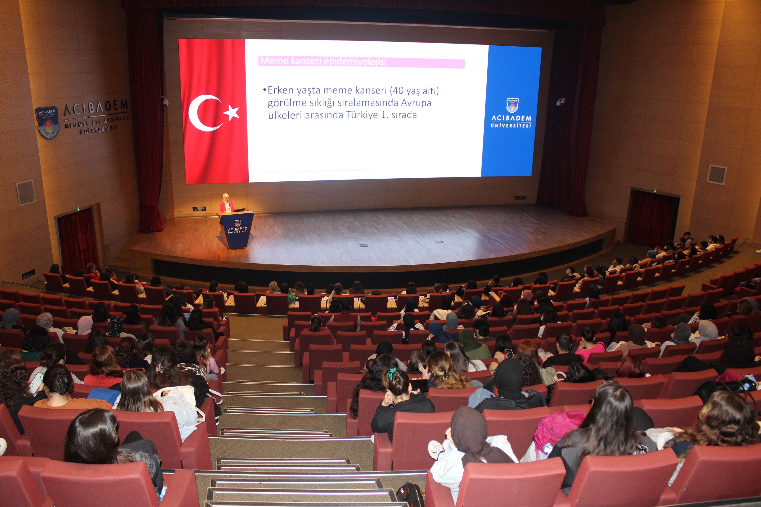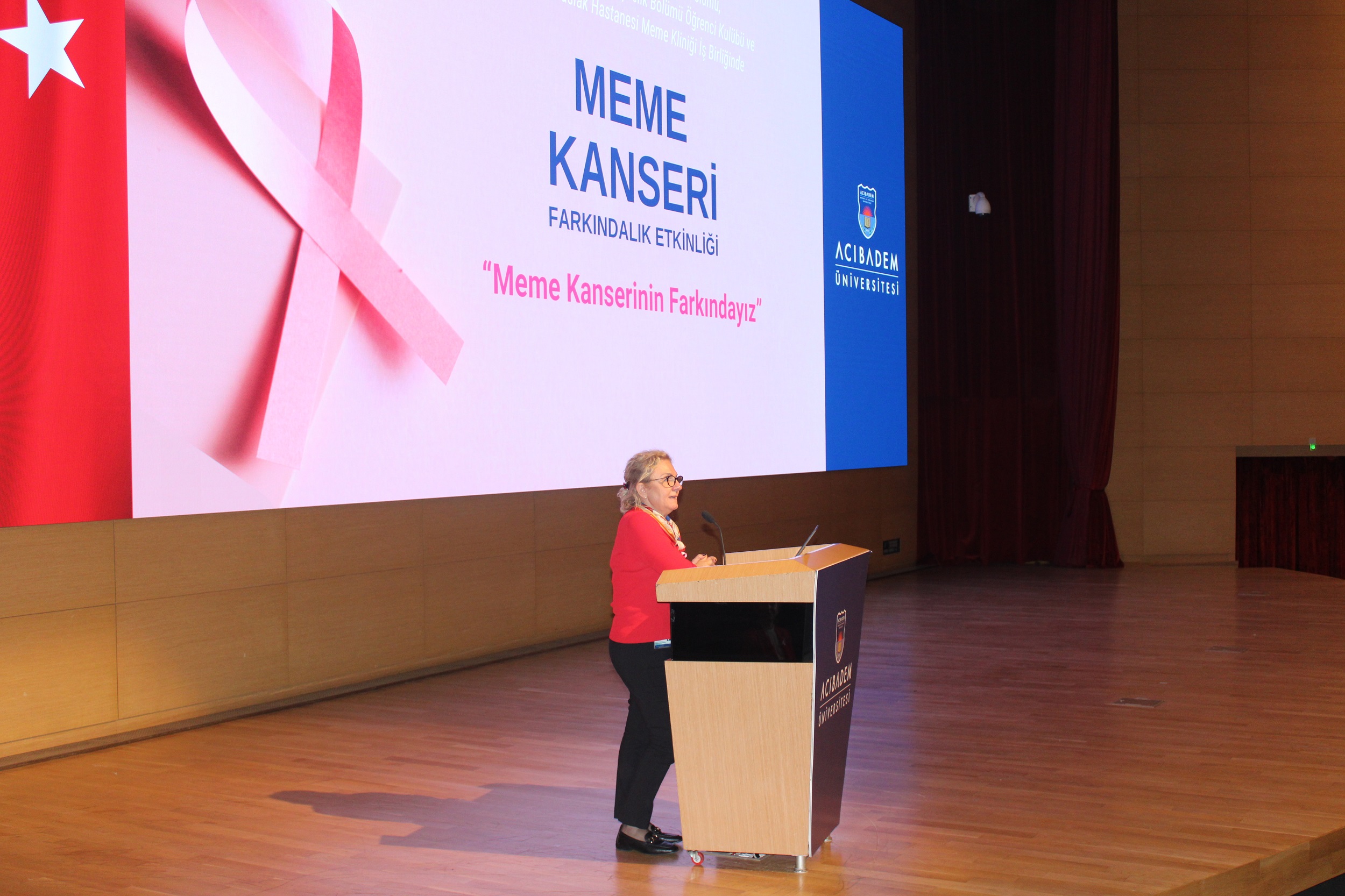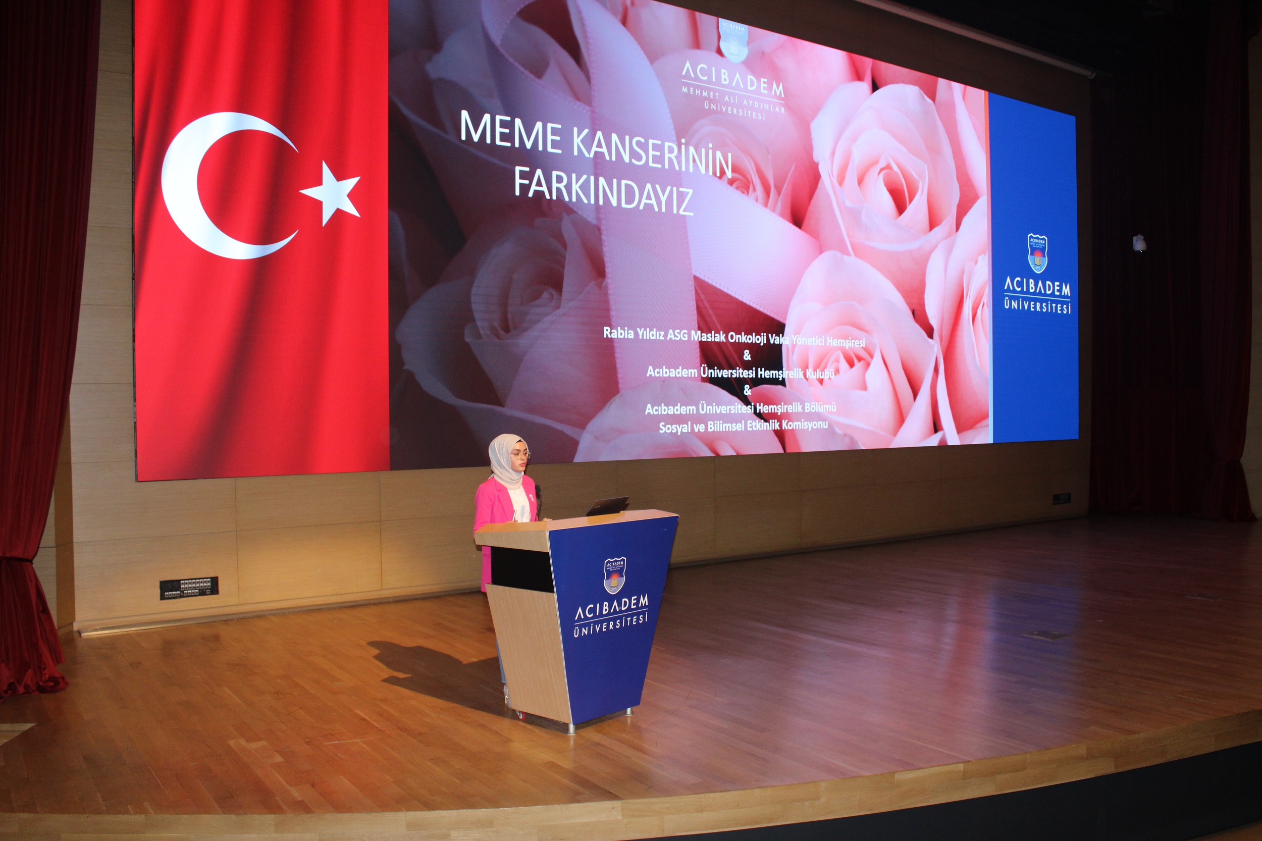 Acıbadem Üniversitesi Hemşirelik Bölümü ve Acıbadem Maslak Hastanesi Senoloji Merkezi tarafından düzenlenen Hemşirelik Bölümü öğrencilerinin ve yakınlarının meme kanserine yönelik bilgilendirilmesi, ulusal meme kanseri tarama programlarına yönelik farkındalığın arttırılması amacıyla “Meme Kanserinin Farkındayız” adlı etkinlik gerçekleşti. Sağlık Bilimleri Fakültesi Hemşirelik Bölümü Başkanı Prof. Dr. Ükke Karabacak’ın açılış konuşması ile başlayan etkinlikte, Hemşirelik Kulübü Başkanı Kübra Kılıç; meme kanseri, risk faktörleri, belirtileri, önlenmesi ve Ulusal Kanser Tarama Programı hakkında bilgi verdi. Katılımcılara özel olarak hazırlanan ‘Kendi kendine meme muayenesi’ videosu gösteriminin ardından Dr. Öğr. Üyesi Nermin Ocaktan moderatörlüğünde meme kanseri vaka yönetici hemşiresi ile söyleşi gerçekleştirildi.