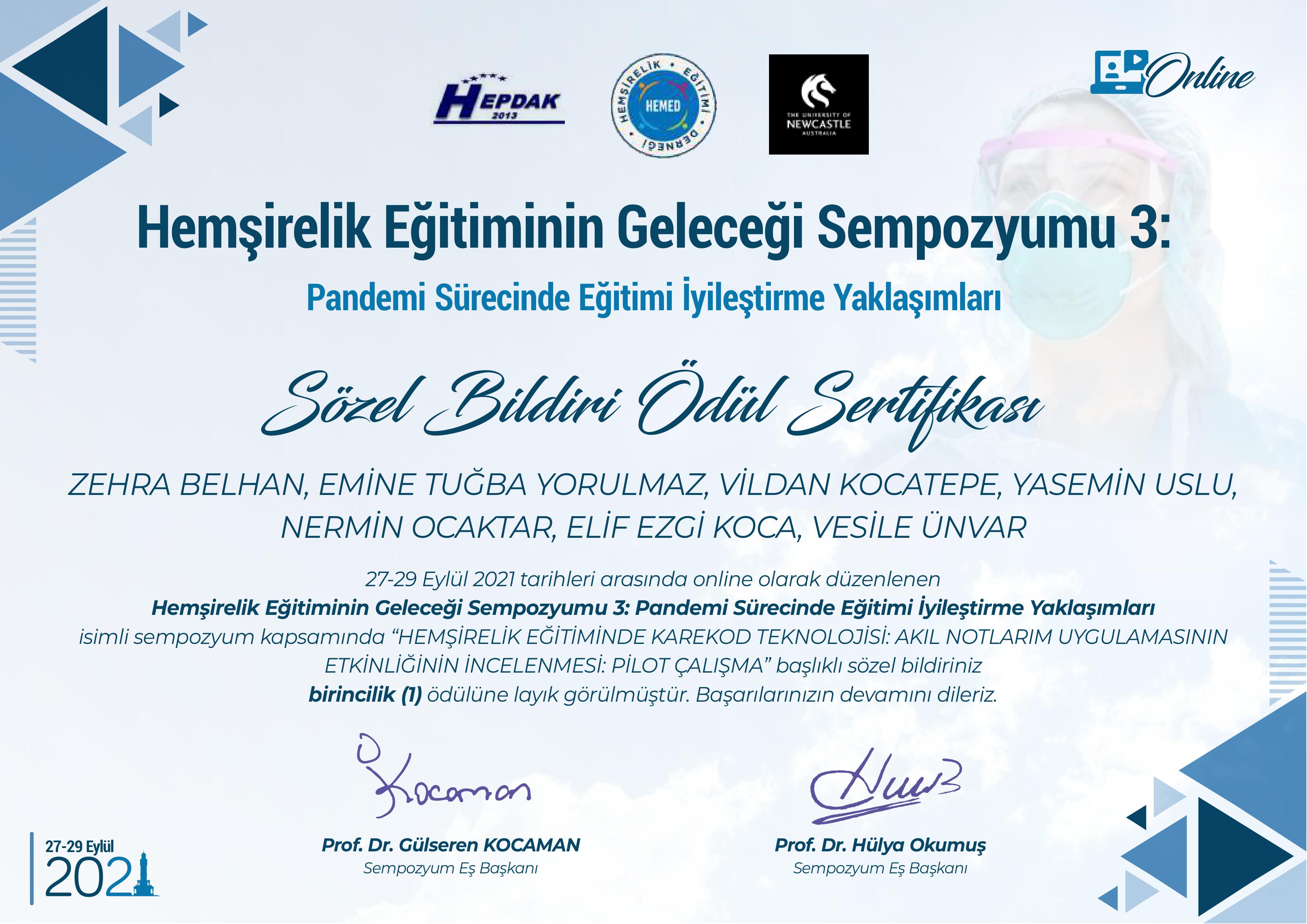 “Hemşirelik Eğitiminin Geleceği Sempozyumu 3: Pandemi Sürecinde Eğitimi İyileştirme Yaklaşımları” adlı etkinlik 27-29 Eylül 2021 tarihleri arasında çevrim içi olarak gerçekleşti. Etkinlik kapsamında öğretim üyelerimizin hazırladığı “Hemşirelik Eğitiminde Karekod Teknolojisi: Akıl notlarım uygulamasının etkinliğinin incelenmesi: Pilot çalışma” başlıklı sözel bildiri birincilik ödülüne layık görüldü.Çalışmada yer alan araştırmacılar: Prof. Dr. Vesile Ünver, Dr. Öğr. Üyesi Vildan Kocatepe, Dr. Öğr. Üyesi Yasemin Uslu, Arş. Gör. Emine Tuğba Yorulmaz, Uzm. Hem. Zehra Belhan, Uzm. Hem. Nermin Ocaktan, Eğitim Teknoloğu Elif Ezgi Koca.