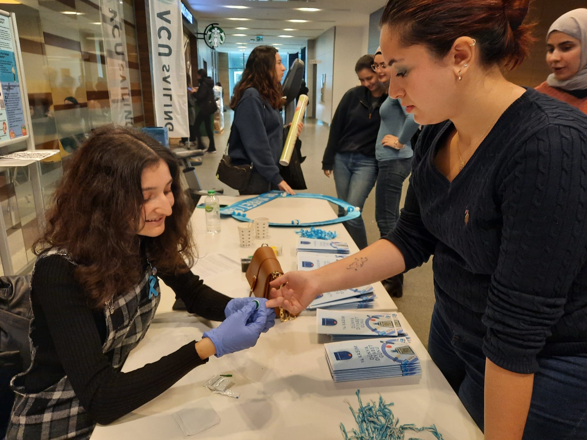 Etkinlik, İç hastalıkları dersi kapsamında 2. sınıf öğrencileri ile hemşirelik kulübü üyeleri tarafından Aplus cafe önünde yer alan stantta gerçekleştirildi. Öğrenciler tarafından üzerinde “Biz diyabetin farkındayız ya siz?” yazılı stickerlar, eğitim broşürleri ve yaka kurdeleleri katılımcılara dağıtıldı. İsteyen katılımcıların kan şekerleri ölçülerek glisemik değerleri hakkında bilgilendirme yapıldı. Spora ve aktif yaşama dikkat çekmek için bisiklet sürme ve merdiven çıkma yarışları yapıldıktan sonra etkinlik sonlandı.