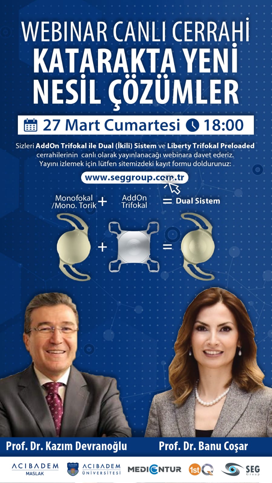 Tıp Fakültesi Göz Hastalıkları Anabilim Dalı Başkanı Öğretim Üyemiz Prof.Dr. Banu Çoşar ve Acıbadem Üniversitesi Maslak Hastanesi Göz Hastalıkları Uzmanı Prof. Dr. Kemalettin Kazım Devranoğlu tarafından gerçekleştirilen genel cerrahi webinarı: Katarakta Yeni Nesil Çözümler 27 Mart 2021 tarihinde gerçekleşti.Eğitim amaçlı düzenlenen webinarda yeni eklenti göziçi (AddOn) lenslerin implantasyon tekniklerini öğretildi. Eğitime 450 farklı hastaneden 600 göz doktoru katıldı. Webinarda geri dönüşlü trifokalite sağlayan AddOn lensler ve trifokal lensler konuşuldu. Bu lensler uzak-orta-yakın mesafede gözlüksüz görüş sağlıyor.