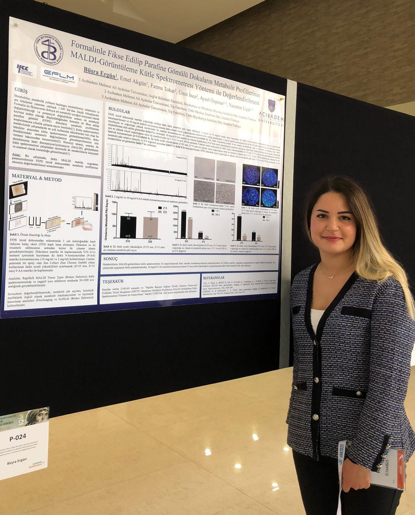 Sağlık Bilimleri Enstitüsü Biyokimya ve Moleküler Biyoloji Yüksek Lisans Programı öğrencisi Büşra Ergün, 32. Ulusal Biyokimya Kongresi’nde “FFPE Dokuların Metabolit Profillerinin MALDI-Görüntüleme Kütle Spektrometresi Yöntemi ile Değerlendirilmesi” başlıklı bildirisi ile Poster 1.’lik Ödülü’nü almaya hak kazandı.Ödüle layık görülen çalışmanın yürütücüsü Tıp Fakültesi Tıbbi Biyokimya Anabilim Dalı Dr. Öğr. Üyesi Yasemin Uçal; Tıp Fakültesi Tıbbi Biyokimya Anabilim Dalı Başkanı Prof. Dr. Aysel Özpınar, Tıp Fakültesi Tıbbi Patoloji Anabilim Dalı Başkanı Prof. Dr. Ümit İnce ve Öğr. Üyesi Doç. Dr. Fatma Tokat ile Sağlık Bilimleri Enstitüsü Biyokimya ve Moleküler Biyoloji Doktora Programı öğrencisi Emel Akgün ise çalışmaya katkı sağlayanlar arasında yer alıyor.