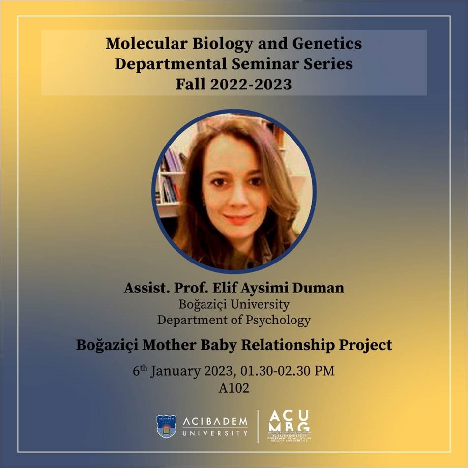 Mühendislik ve Doğa Bilimleri Fakültesi Moleküler Biyoloji ve Genetik Bölümü tarafından düzenlenen seminerler serisi kapsamında “Boğaziçi Mother Baby Relationship Project” başlıklı etkinlik 6 Ocak 2023 tarihinde gerçekleştirildi.