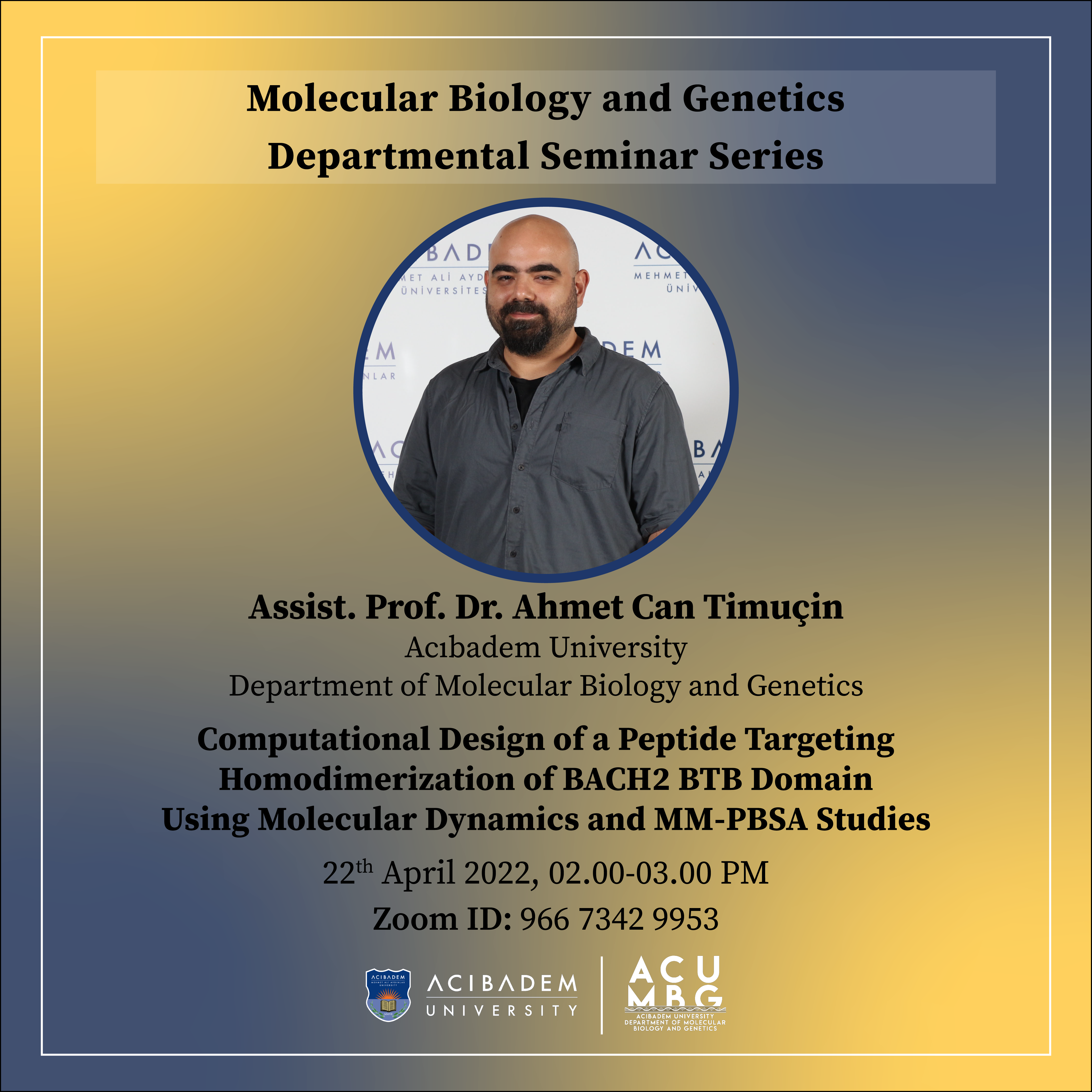 Mühendislik ve Doğa Bilimleri Fakültesi Moleküler Biyoloji ve Genetik Bölümü tarafından düzenlenen seminerler serisi kapsamında Nisan ayı etkinlikleri gerçekleştirildi. Öğretim üyeleri, lisans ve lisansüstü öğrencilerin katılımıyla çevrim içi gerçekleşen seminerlerde alanında uzman farklı konuşmacılar ağırlandı. Konuşmacıların bilimsel çalışmalarından da bahsedildiği etkinliklerde konuşmacılar; bilgi, tecrübe ve birikimlerini katılımcılara aktardı. Seminerler katılımcıların sorularının cevaplandırılmasıyla sona erdi.Nisan ayı seminer başlıkları ve konuşmacıları:8 Nisan 2022Daha Etkin Sözlü Sunumlar için Bir Yol Haritası – Prof. Dr. Ferhan Girgin Sağın, Ege Üniversitesi Tıp Fakültesi Tıbbi Biyokimya AD 12 Nisan 2022Konuşabilmekle Konuşmayı Bilmek Arasındaki Fark – İsmet Topaloğlu 15 Nisan 2022 Discovery of Novel Misshapen Pathogenic Tau Protein in Age-dependent Neurodegenerative Disorders – Assist. Prof. Dr. Önder Albayram, Medical University of Sourth Carolina Department of Neuroscience, Department of Neuropathology 22 Nisan 2022Computational Desing of a Peptide Targeting Homodimerization of BACH2 BTB Domain Using Molecular Dynamics and MM-PBSA Studies – Assist. Prof. Dr. Ahmet Can Timuçin, Acıbadem University Department of Molecular Biology and Genetics