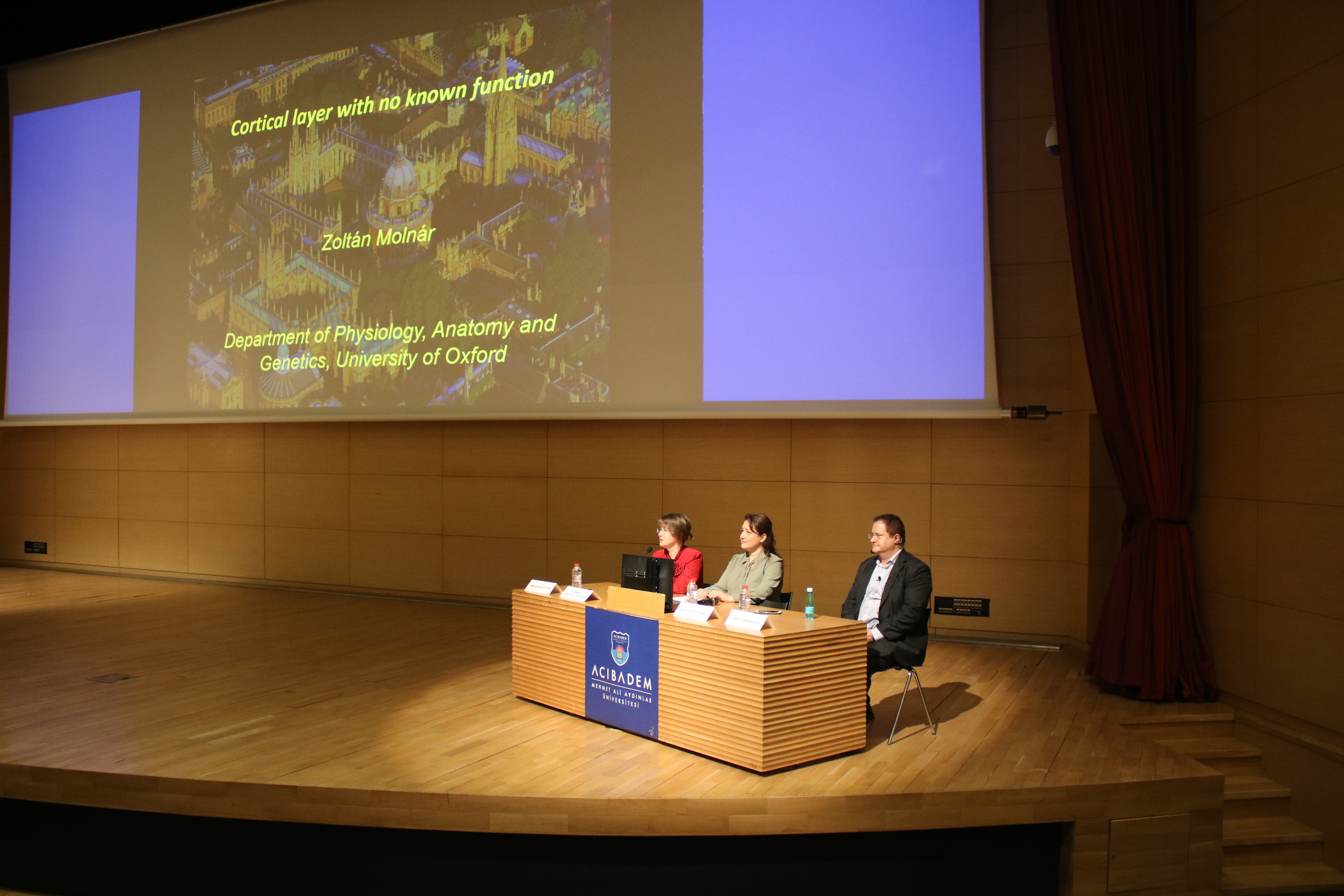 Nörobilimde güncel gelişmeleri genç araştırmacılarla paylaşmak, nörobilim alanındaki çalışmalar için bilim insanı adaylarını teşvik etmek ve öğrencileri uluslararası platformdaki hocalarla buluşturmak amacıyla düzenlenen konferansta, Oxford Üniversitesi Öğretim Üyesi Prof. Dr. Zoltán Molnár ve Lund Üniversitesi Öğretim Üyesi Prof. Dr. Deniz Kırık konuşmacı olarak ağırlandı. Konferansta ilk olarak Prof. Dr. Zoltán Molnár “Cortical layer with no known function” başlıklı sunumuyla gelişimsel nörobiyoloji alanında çalışmalardan bahsetti. Sunumunun ardından Prof. Dr. Molnár, Klinik Nöroloji’nin kurucusu olan Thomas Willis (1621-1675) ve bilim hakkında biyografik bir konuşma gerçekleştirdi. Konferansın ikinci konuşmacısı Prof. Dr. Deniz Kırık ise “Stem cell therapies for Parkinson’s disease: Translation from research to the clinics” başlıklı sunumunu katılımcılarla paylaştı. Prof. Dr. Kırık, parkinson haslığı ve dopaminerjik nöronlar üzerinde yaptığı çalışmalar hakkında katılımcıları bilgilendirdi.