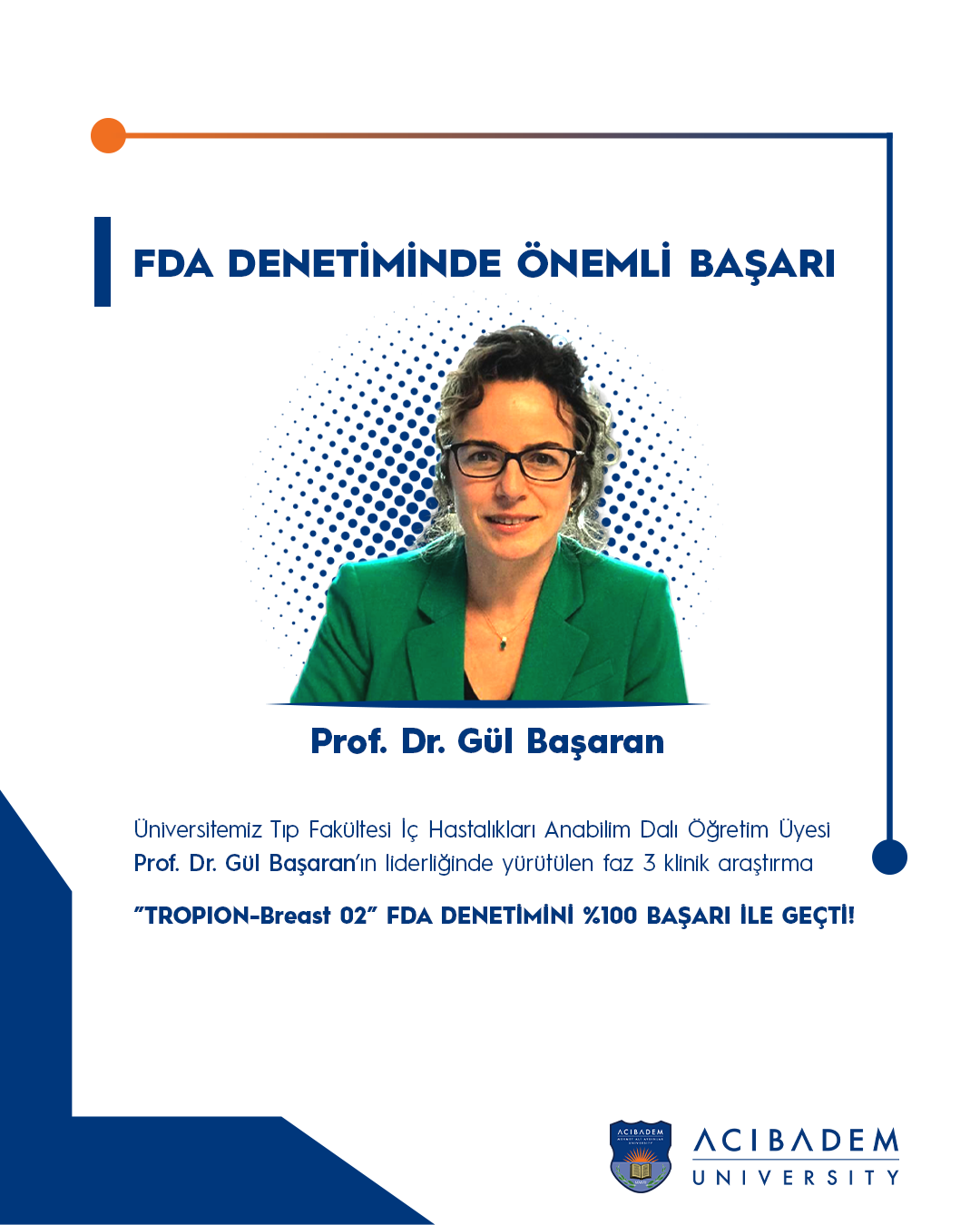 Acıbadem Üniversitesi Tıp Fakültesi İç Hastalıkları Anabilim Dalı Öğretim Üyesi Prof. Dr. Gül Başaran’ın liderliğinde yürütülen "erişkin onkolojisi" alanındaki faz 3 klinik araştırma "TROPION-Breast 02”, Food and Drug Administration (FDA) tarafından gerçekleştirilen denetimde hiç bulgu almadan %100 başarılı bulunmuştur.