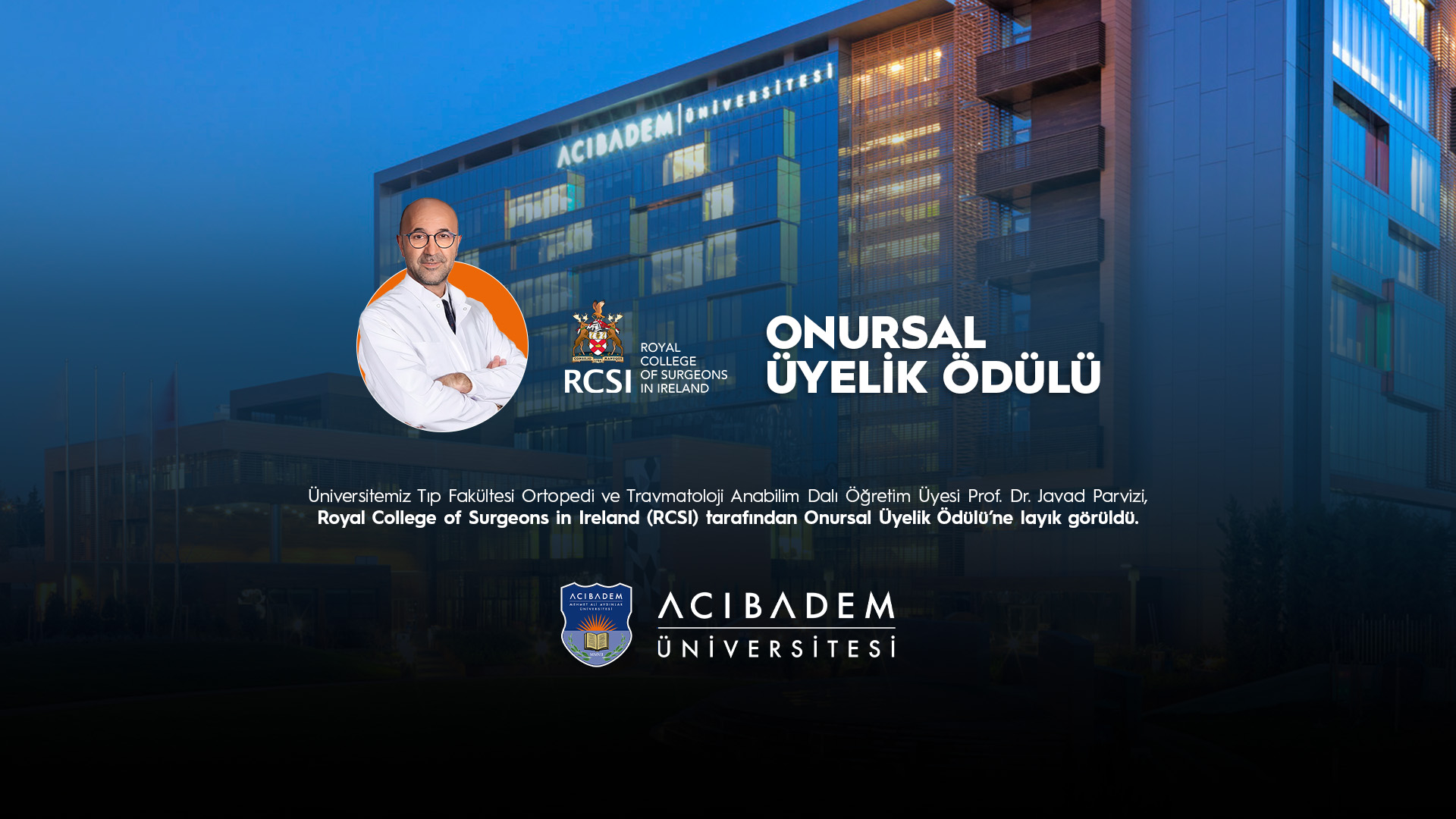 Üniversitemiz Tıp Fakültesi Ortopedi ve Travmatoloji Anabilim Dalı Öğretim Üyesi Prof. Dr. Javad Parvizi, Royal College of Surgeons in Ireland (RCSI) tarafından Onursal Üyelik Ödülü’ne layık görüldü.