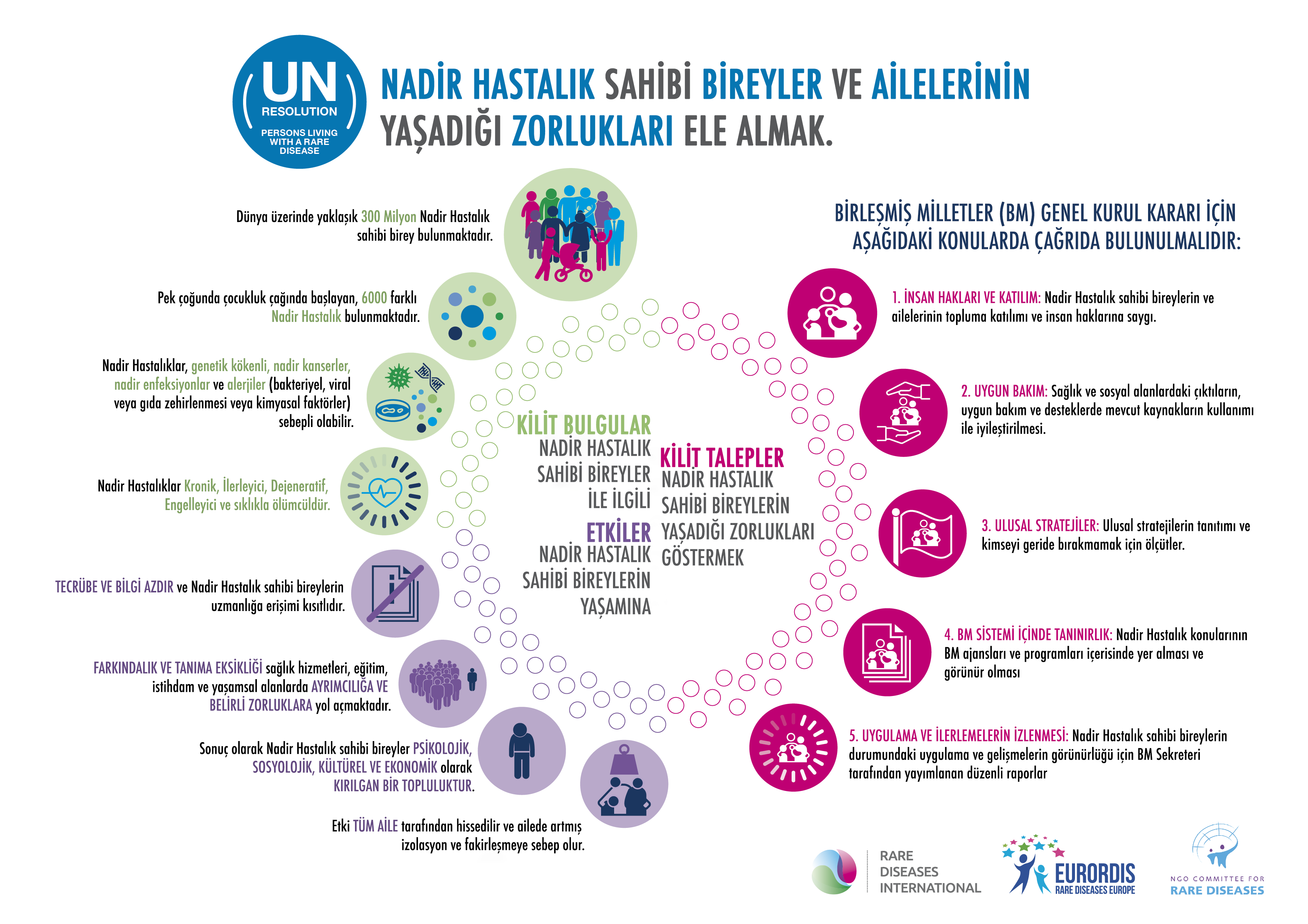 Nadir Hastalıklar için STK Komitesi (NGO Committee for Rare Diseases), Uluslararası Nadir Hastalıklar (RDI) ve EURORDIS Avrupa Nadir Hastalıklar üyeleri tarafından başlatılan kampanya, Birleşmiş Milletler (BM) Genel Kurul Kararı’nın alınması çağrısında bulunuyor.Nadir Hastalık Sahibi Bireylerin (NHSB) ve ailelerinin 2021’ de yaşadığı zorlukları görünür kılmayı hedefleyen kampanyanın genel amacı; NHSB’in gözden kaçan ve asıl dikkat gerektiren bir nüfus olduğunu kabul etmek ve bu bireylerin ihtiyaçlarını karşılayan, BM 2030 Gündemine ulaşılmasına katkıda bulunan “Kimseyi Geride Bırakma” sloganına uygun olarak küresel ve ulusal politikalara ulaşmaktır.Konu ile ilgili detaylı bilgiye ulaşmak için tıklayın.