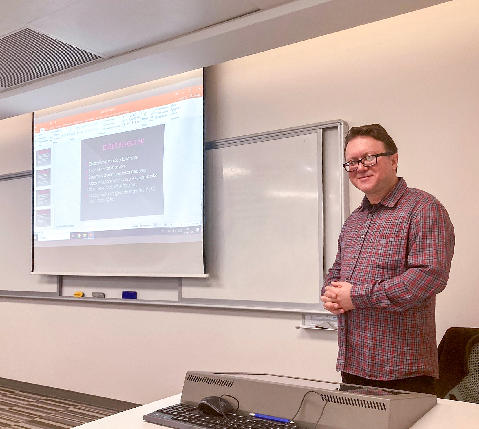Kolokyum konuşmacısı Marmara Üniversitesi Sosyoloji Bölümü öğretim üyesi Doç. Dr. Melih Çoban, Türkiye’de madde bağımlılığı konusundaki son durumu kendi araştırma verilerine de dayanarak ele aldı. Yüz yüze gerçekleşen ve İzleyenlerin soru ve yorumlarıyla tamamlanan toplantıya 70 öğretim üyesi ve öğrenci katıldı.