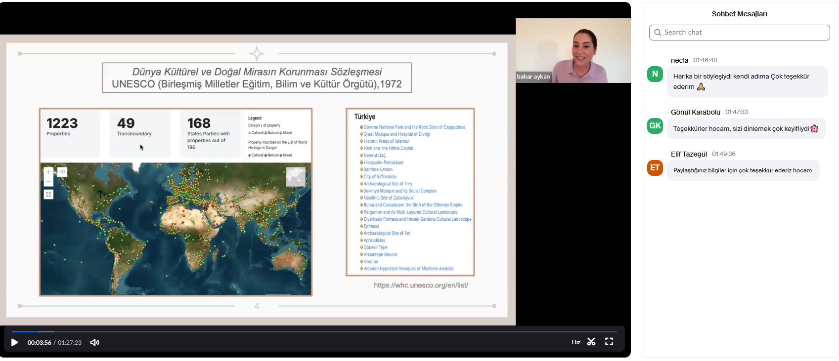 Konuşmacı, miras unsurlarının seçiminde toplumsal çeşitliliğin ve yerel halkların görüşlerinin göz önünde bulundurulmasının gerekliliğini ifade etti. Konuşma, 75 katılımcı tarafından ilgiyle izlendi ve kültürel mirasın toplumsal bağlamda nasıl daha geniş bir perspektifle ele alınması gerektiği üzerine verimli bir tartışma ortamı sağladı.