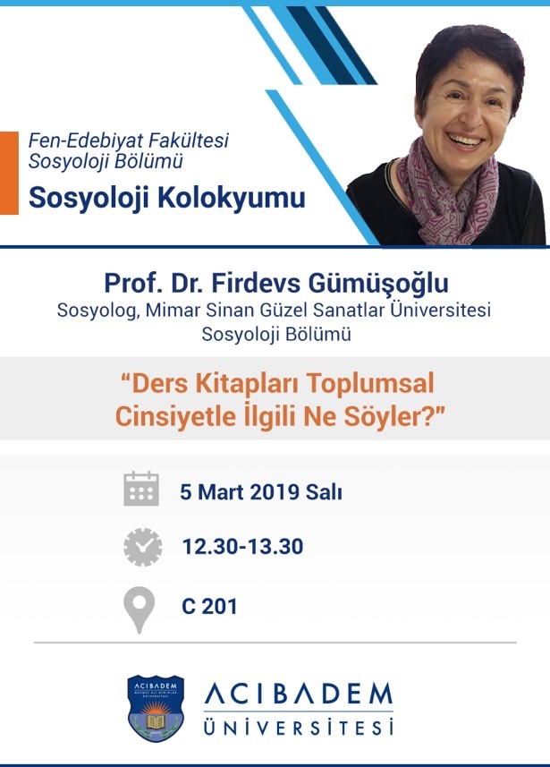 Sosyoloji Bölümümüzün düzenlediği kolokyum, 5 Mart 2019 tarihinde gerçekleşti. “Ders Kitapları Toplumsal Cinsiyetle İlgili Ne Söyler?” başlıklı kolokyumda Mimar Sinan Güzel Sanatlar Üniversitesi Sosyoloji Bölümü Öğretim Üyesi Sosyolog Prof. Dr. Firdevs Gümüşoğlu konuşmacı olarak ağırlandı. Sosyolog Prof. Dr. Gümüşoğlu konferansında Cumhuriyet’in kuruluşundan günümüze ilkokul ders kitaplarında kullanılan bazı anlatılar ve görsel malzemenin toplumsal cinsiyet rollerine ilişkin nasıl mesajlar taşıdığını, bu içerik ve mesajların dönem dönem nasıl değiştiğini gösteren çalışması hakkında ayrıntılı bilgi verdi.